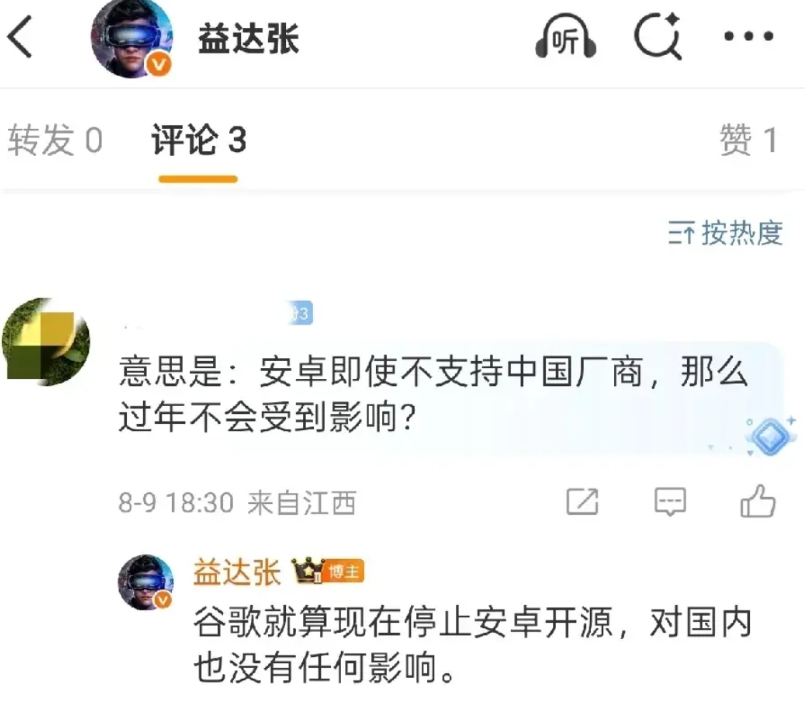 他指出,即便谷歌停止更新Android,国内厂商也有能力继续开发、完善自家的系统。并且,他还着重表示,谷歌停止开源,对国内厂商而言,也毫无影响。