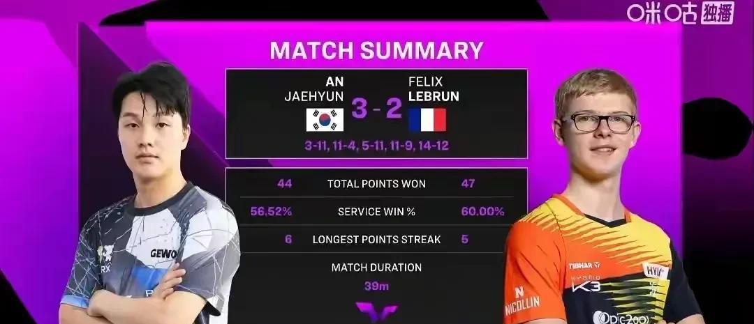 WTT横滨冠军赛最后一场男单1/8决赛,韩国一哥安宰贤以3-11、11-4、5-11、11-9、14-12逆转险胜小勒布伦,为队友张禹珍报了一箭之仇,他也拿到了最后一个八强席位,将与莫雷加德争夺四强资格。