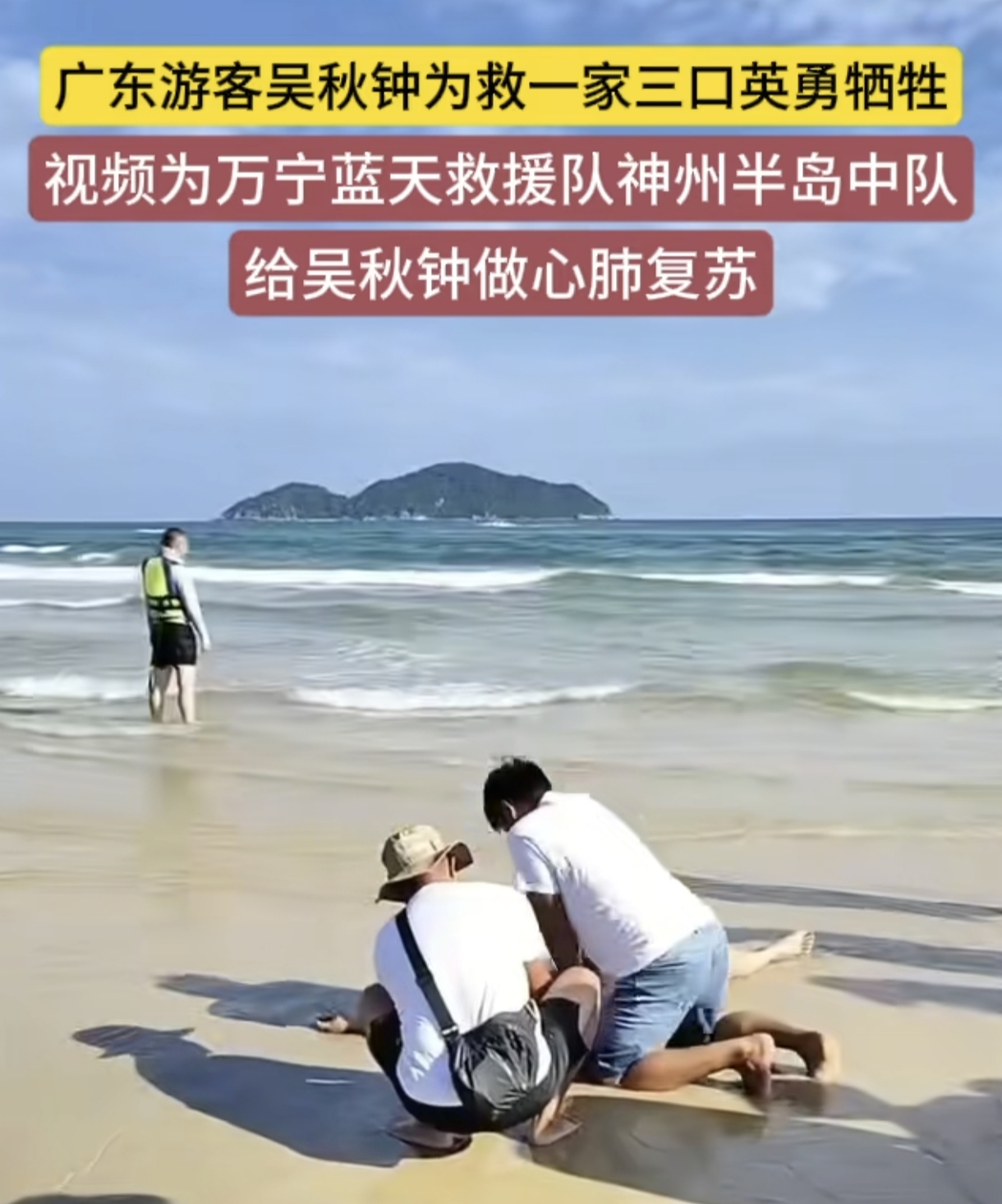 37岁吴秋钟救人牺牲了,海边游玩要注意离岸流! 8月8号下午4点多,海南万宁神州半岛乐涛湾出事了。广西的于先生带着两闺女在海边玩,14岁和11岁的孩子突然被离岸流卷进深水区,于先生赶紧跳下去救,可海浪太大,父女三人很快就没力气了,在水里漂着喊救命。 这时候37岁的广东游客吴秋钟听见呼救,想都没想就跳进海里去救人。他先抓住于先生的大女儿往回游,可离岸流太厉害老是把他们往深海拖,他自己也陷进去了。旁边一个穿救生衣的大学生刘瑞看见也跳了下去,于先生带着俩女儿抓住刘瑞的救生衣总算是能浮着了,可吴秋钟已经没有力气,没能抓住救生衣慢慢漂远。 附近航海俱乐部的黄名奇、唐惠师开着摩托艇赶过来,先是把于先生一家和刘瑞救上艇。因为摩托艇坐不下,唐惠师就跳下去把救生衣扔给吴秋钟,等第二艘摩托艇回来救他时吴秋钟已经没意识了。大家把他拖上岸,蓝天救援队和医生轮流做了1小时心肺复苏,还是没能救回来,因为溺水时间太长了。 于先生说特别难受,连句谢谢都没来得及跟吴秋钟说,现在一家人现在还在万宁,想送英雄最后一程。 吴秋钟13岁的儿子亲眼看着爸爸被救上岸,却再也没醒过来。 现在万宁市已经在给吴秋钟申报“见义勇为”称号,好多目击者都说他是用自己的命换了别人的希望。 提醒大家:离岸流特别危险,看着不起眼,能一下子把人卷到深海里,去海边玩一定要多注意警示标志,不熟悉的水域别随便下水,真要是遇险了,先想办法漂着呼救,别瞎使劲浪费体力。
