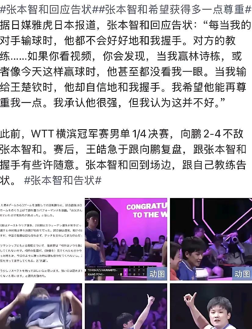 我呸!!小日子张本赢了向鹏进了半决赛,当场就没忍住,疯了似的庆祝。先是把衣服扯下来蒙头上,嗷嗷乱叫,那动静隔着老远都能听见;接着攥着拳头使劲往旁边甩,胳膊甩得跟要飞出去似的,嘴里还不停狂喊,恨不得让全场都知道他赢了;更狂的是,他直接竖起一根手指头,冲着观众席就吼,那架势明摆着——他觉得自己已经是天下第一了。 最让人看不惯的是,这小子还倒打一耙,说王皓跟他握手的时候态度不正面。可明眼人都看得清清楚楚,王皓早就把手伸出来等着了,是他自己光顾着瞎庆祝,磨磨蹭蹭半天才过来握手,这能怪谁? 怎么着?赢了个向鹏,还想让王皓抱着你庆祝?你算哪根葱?真狂得没边了,不知道自己几斤几两。有本事明天跟大头碰上,你再试试这嚣张劲儿? 他还对外说中国队教练没体育精神。日媒也跟着瞎报,说8月10号那天比赛,他赢了向鹏之后,跟中国队的人握手,中国教练没看他,就手碰了一下。他还说,之前赢林诗栋的时候,这教练也这样,连看都不看他;可他输给王楚钦那次,对方握手就挺自信。 他还说希望教练尊重他,承认中国队强,但觉得这态度不好。这话听着就可笑,先想想自己赢了之后那副德行,再看看握手时是谁慢待谁,还好意思谈尊重?真把自己当盘菜了。