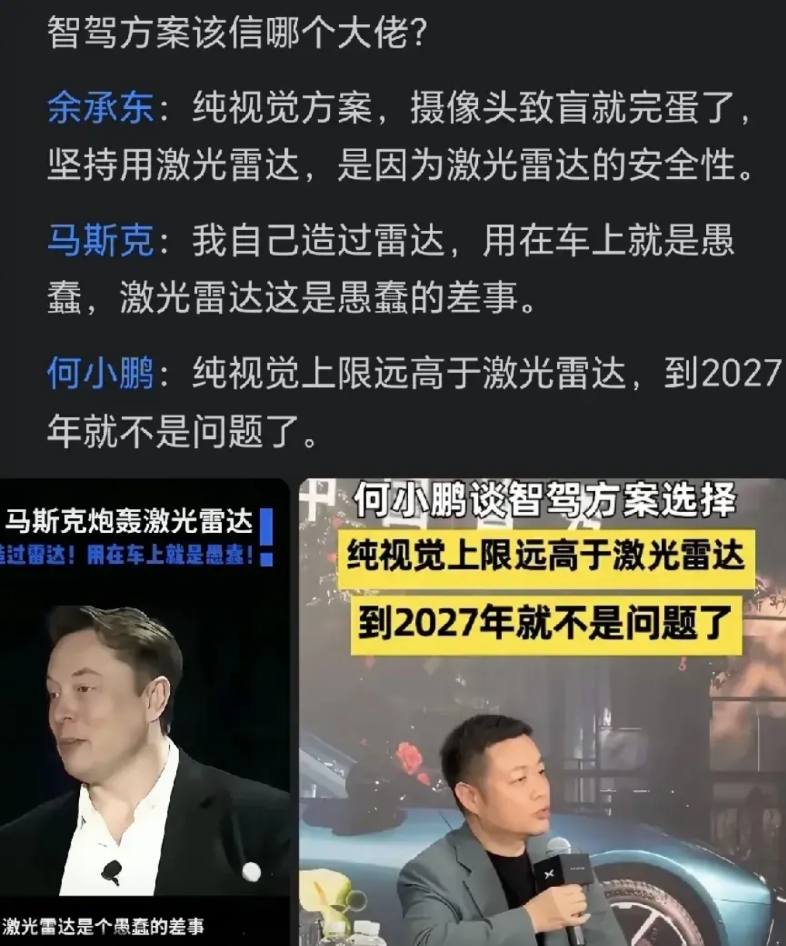 马斯克和何小鹏都支持纯视觉方案,余承东支持激光雷达,就好比蝙蝠比小鸟更不容易撞墙