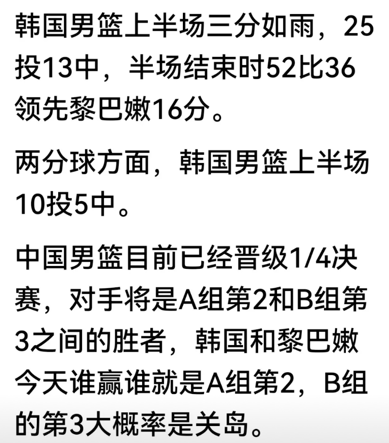 韩国男篮一波三分雨浇的黎巴嫩透心凉!此战获胜后韩国A组第二,将与B组第三争夺八强席位。B组第三大概率是关岛,而且大概率会输给韩国。因此八进四中国队vs韩国,我个人认为中国男篮赢面比较大,但是韩国人不讲理的三分雨还是让人多少有点忌惮。好在此届中国男篮的三分雨也下得不错!