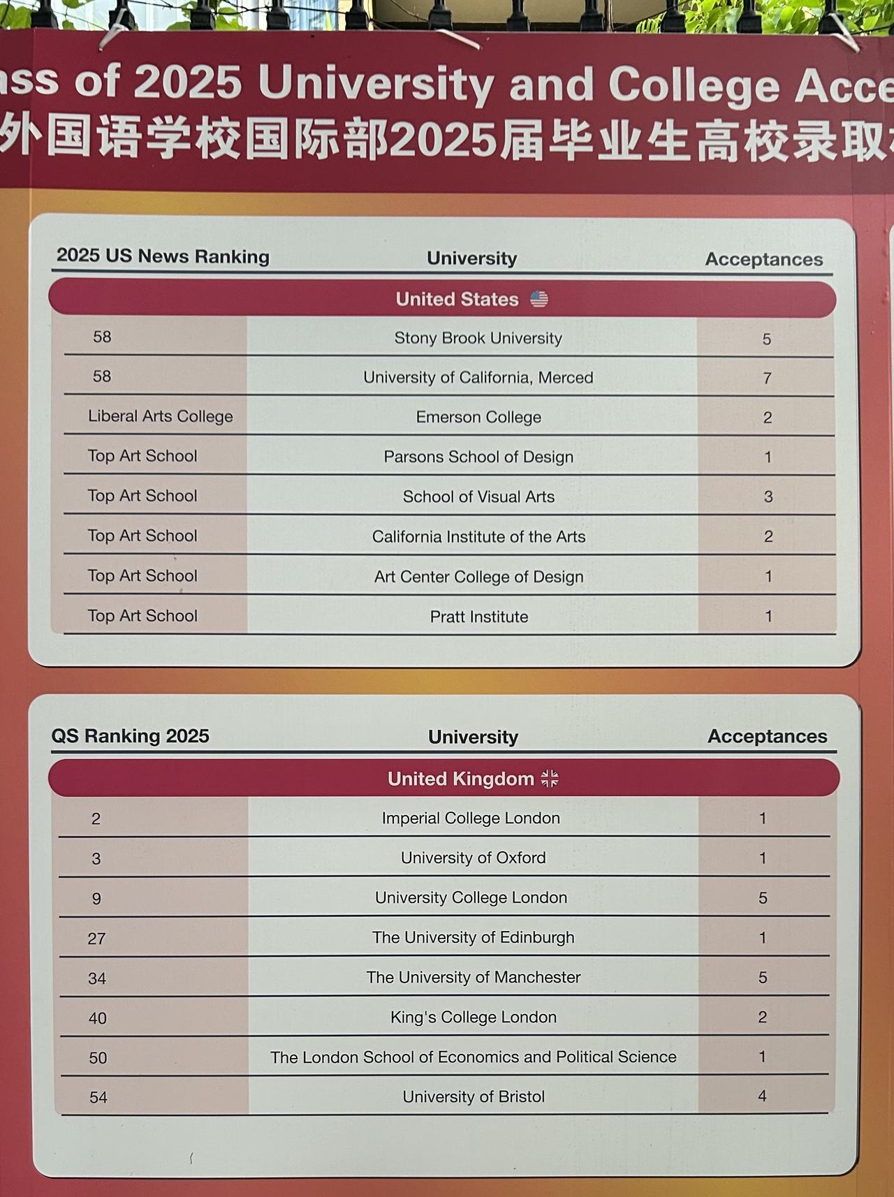 饭后散步路过深圳外国语学校国际部,围墙外面挂着2025年高校录取榜单。根据榜单,深外国际部2025届共有41名毕业生收到了来自70所大学的总计206份录取通知书,人均5个offer。 92%的学生获得了USNEWS和QS世界大学排名前50的录取通知。100%的学生获得了USNEWS和QS世界大学排名前70的录取通知。 大伙瞧瞧如何?中肯的说,不是特别拔尖,但也不差