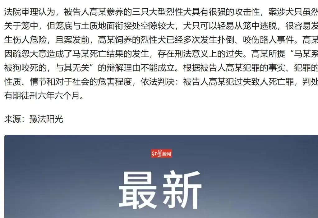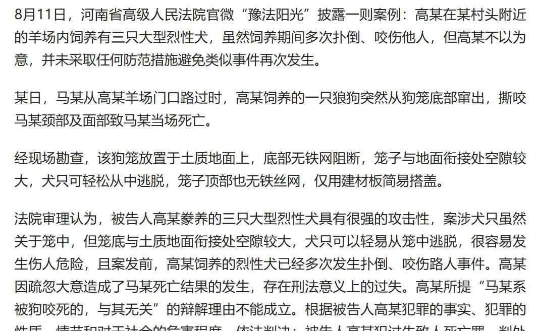河南,男子养了3只大型烈犬,非常凶猛,它们多次扑倒和咬伤路过的人,但男子都不以为然,导致这几只狗更猖狂了,一个村民路过,一只狼狗竟然直接扑过来,撕咬他的面部和颈部,导致村民当场失去生命,但男子还不知悔改,还辩称:村民是狗咬死的,我没有罪! 8月11日红星新闻报道,提起村头羊场的那3只大型猎犬,村民们都瑟瑟发抖,经过那里都要绕道而过,害怕惊动了那几只狗。 村民们都害怕这几只狗,这并非夸大事实,实在是这几只狗太厉害了,有很多次,村民们从羊场经过,这几只狗多次扑倒了村民,还咬伤村民。 从此这几只狗在村里就出了名,大家提起这几只狗,都觉得非常害怕,更是不敢经过羊场了。 正是如此,大家对狗主人高某非常不满,高某经营着羊场,他养了这三只大型烈犬,就是帮他看羊场的,这几只狗那么凶猛,他还引以为傲,他从来没有老老实实地拴住这几只狗。 即使有村民被这几只狗扑倒,咬伤,他依然不以为然,反而觉得有了这几只狗,羊场安静多了,经过的人都不多几个。 正是由于高某的纵容,这几只狗越发猖狂了,见人就想咬。 有一天,马某很不幸,他虽然听说过高某的那三只狗非常厉害,但那天,正好他有事不得不从羊场经过。 他听说了,那天,高某是把那几只狗关在笼子里的,马某觉得既然狗在笼子里,那么他经过这里,顶多狗会吠叫几声,不至于出来扑人,咬人。 反正狗被关起来了,他也放松了警惕,大胆地从羊场经过,却不料就在这时,一只狼狗突然就窜了出来。 马某还没反应过来,就被狼狗扑倒在地,当他想反抗时,狼狗已经死死地咬住他,并且这狼狗本来就很大,马某根本没有那么大的力气反抗。 更加危险的是,狼狗咬住的是马某的脖子,没等马某反抗,它就狠狠地咬了一口,紧接着马某的脸部也被咬了。 由于马某的重要位置被咬,当场马某就失去了反抗力,等别人发现时,马某已经失去了生命。 为什么狼狗拴住了还会跑出来咬人呢? 原来高某根本没有想过,要将这几只狗关死,他的这只狗笼是放在地面上的,底部是没有铁网丝的,笼子和地面相接的空隙很大,养狗要逃出来,根本不费吹灰之力。 所以当马某经过羊场,狼狗发现之后,就从底部逃出来,将马某给咬了。 马某的悲剧就此发生了,发生这件事之后,马某的家属肯定起诉了高某,要求他承担此事的责任。 但令人气愤的是,高某依然没有意识到自己的错,还在为自己辩称,说马某是被狗咬死的,他能有什么罪呢! 高某此话一出,不但马某的家属气愤了,全村的村民都气愤了。 高某的这几只大型烈犬,他都不知村民们已经人心惶惶的,大家都希望高某要为此付出代价。 那么高某该付出怎样的代价呢? 首先,高某圈养这几只大型的烈犬,他没有采取防护措施,他本来就是有过错的。 他饲养的动物造成他人人身损害或者死亡,他都是要承担责任的。 其次,高某明知道自己的这几只狗多次扑倒村民,和咬伤村民,他养的这几只狗是存在安全隐患的,他没有引起重视,没有做好防护措施,导致马某被狗咬死,高某的行为构成了过失致人死亡罪。 《刑法》第233条规定:过失致人死亡的,处三年以上七年以下有期徒刑;情节较轻的,处三年以下有期徒刑。 法院经过审理认为,虽然高某将狗关在狗笼里,但是狗是可以从狗笼底部逃出来的,因马某的死亡是由于高某疏忽大意造成的。 除此之外,高某还要承担赔偿责任。 《民法典》第1179条规定:侵害他人造成人身损害的,应当赔偿医疗费、护理费、交通费、营养费、住院伙食补助费等为治疗和康复支出的合理费用,以及因误工减少的收入。造成残疾的,还应当赔偿辅助器具费和残疾赔偿金;造成死亡的,还应当赔偿丧葬费和死亡赔偿金。 马某因为高某所饲养的狗失去生命,马某的家属可以要高某赔偿。