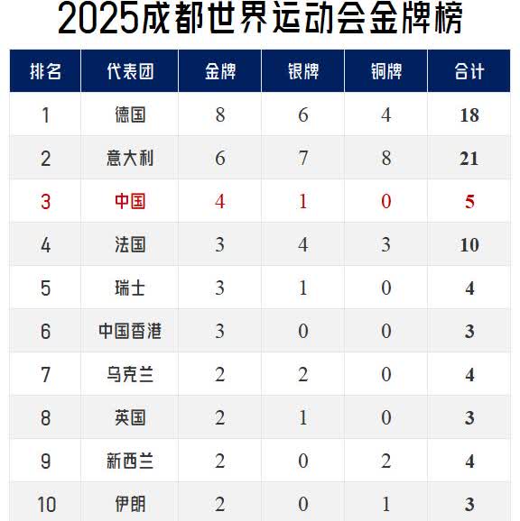 【2025成都世运会前两个比赛日金牌榜更新!中国队以4金1银冲进前三!】 德国以8枚金牌反超意大利稳定金牌榜,意大利以21枚奖牌稳居奖牌榜榜首,中国昨日连夺三金,一举冲进金牌榜前三。 此外,中国香港以三枚金牌列金牌榜第六!