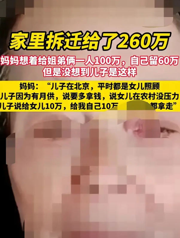 家里拆迁,拿了260万。老妈想给姐弟俩各100万,自己留60万。没想到儿子说自己