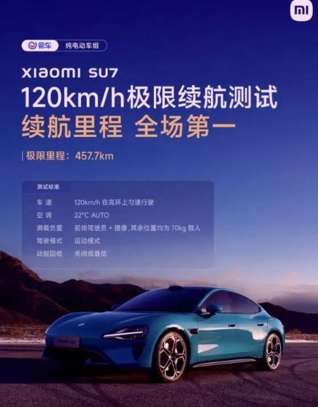 当然这并不是小米自己测试的,而是易车测试的结果。其中小米SU7极限续航是457.7km,而所谓的极限测试方案是前排驾驶员和摄像,后排每个座位是70kg重量假人!驾驶模式:运动模式!动能回收是最低或者是关闭!空调22度,全程高环测试,电量低至无法维持PBox速度120km每小时终止