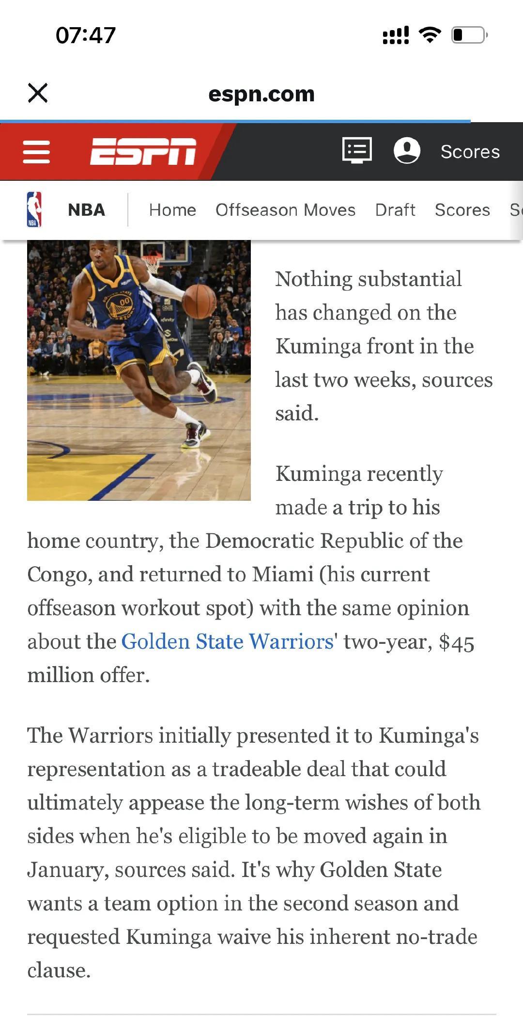 库明加与勇士续约谈判陷入僵局,近10天无进展。勇士坚持两年4500万报价,含球队