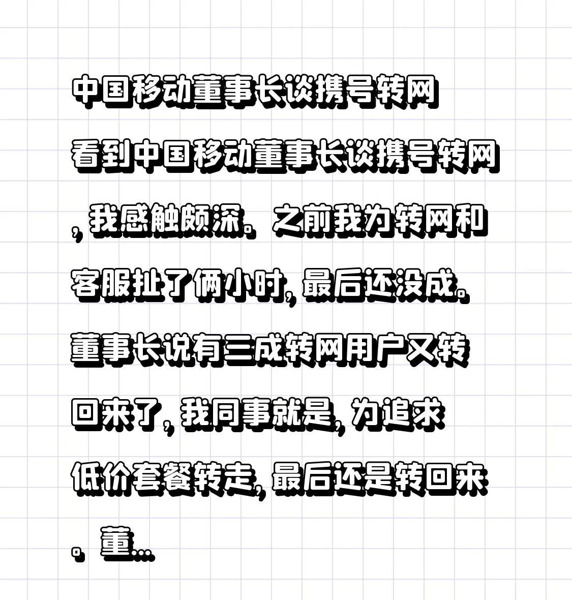 中国移动董事长谈携号转网 看到中国移动董事长谈及携号转网的时候,我内心颇有感触。之前我为了办理携号转网,和客服拉扯了整整两个小时,结果最后还是没能转网成功。董事长提到有三成转网用户又重新转了回来,我的同事就是如此。他当初为了追求低价套餐而转网离开,到最后却又转了回来。 董事长还严厉批评了携号转网存在的乱象。如今市场竞争十分激烈,那些低价大流量卡对运营商造成了很大的冲击。携号转网原本是为了提升用户体验,可现在却成了恶性竞争的源头。 要是真的想要转网的话,那就先列出一个清单,仔细思考自己每个月的话费、使用需求以及是否存在捆绑业务等情况,多比较几家之后再行动。要是被合约限制住了,那就问问客服有没有什么优惠。大家都有过转网的冲动吗?到评论区来说一说吧! #移动转网套餐# #带号转网# #携号带优惠#