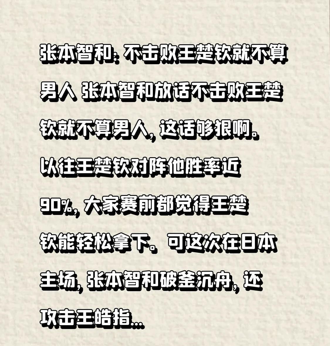 张本智和:不击败王楚钦就不算男人 张本智和宣称:不打败王楚钦就枉为男人。他这话说得可真够决绝的呀。以前王楚钦跟他交手的时候,胜率差不多能达到90%,所以在比赛之前,大家都觉得王楚钦能轻而易举地取胜。 然而这一次在日本主场,张本智和抱着破釜沉舟的决心,甚至还对王皓指导进行攻击,他一心想要证明归化球员的实力,从而消除自己内心的自卑感。 王楚钦在比赛的前几局进攻十分猛烈,他想迅速赢得比赛,好为教练正名。可是呢,他正手相持以及反手对抗的上台率比较低,而且第六局的医疗暂停还打乱了他的节奏。尽管他在先失三局的情况下又奋力拼回了两局,但最终还是输掉了比赛。在多哈世乒赛取得胜利之后,他就背负着疲惫和责任,官方媒体还赋予了他新的领军地位,这给他带来的压力着实不小。这场比赛充满了太多的意外,也有诸多看点。 #国球乒乓王楚钦# #张本智和# #王楚钦巴黎首秀#