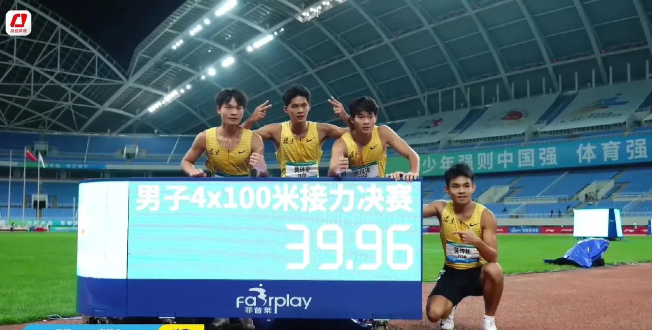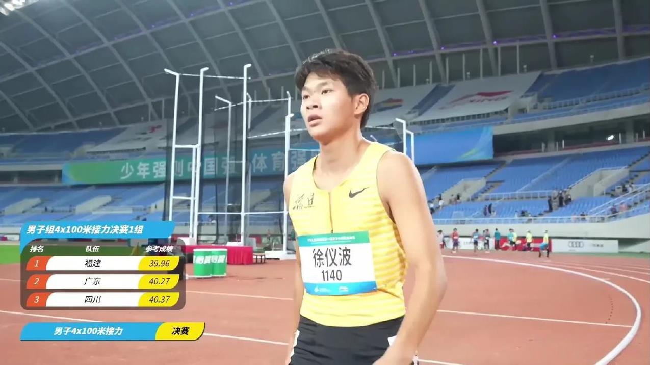 刚刚结束的全国首届青少年田径锦标赛男子4×100米接力决赛,由徐仪波、黄玮豪、吴传彬、赖建光组成的福建队以39秒96的佳绩夺冠,创造了新的全国少年纪录,将这项纪录首次带进40秒大关。
