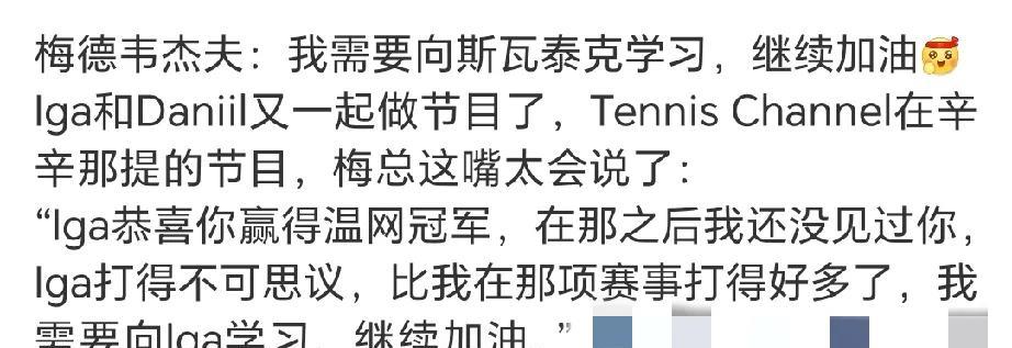 梅德韦杰夫这小嘴叭叭的太甜了! 他和iga一起上Tennis Channel在辛辛那提的节目,丝毫不吝啬对iga的赞美。 梅总说,iga在温网打得不可思议,恭喜你赢的了冠军,我要向你学习,继续加油! 大满贯冠军,有一个都足够球员炫耀一辈子了,但iga才23岁已经拥有六个! 这实力,不只wta女孩们嫉妒得发疯,连很多男子球员都羡慕得眼红了吧。 辛辛那提站之后就是美网了,这次iga会不会继续带来惊喜呢? #新锐创作者成长计划#
