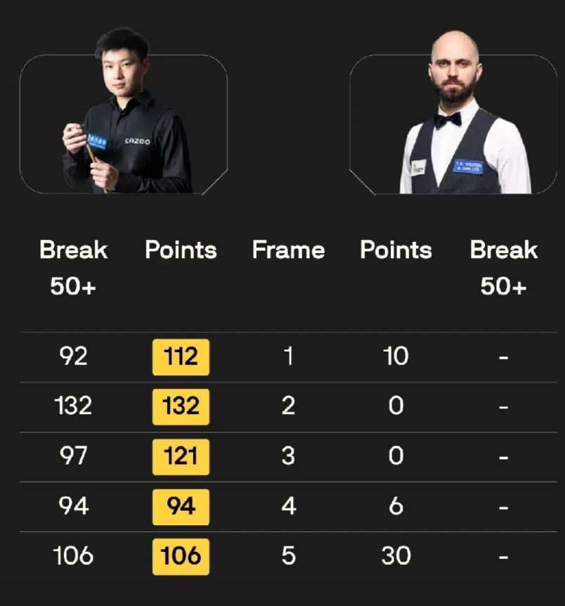 比赛呈现一边倒,赵心童一如既往地神准,让对手无法招架。赵心童偶尔长台不进,对手上手,一旦失误,这一局就报销了。整场比赛,赵心童打出两杆破百,3杆90+,霍尔沃斯两局被零封,另外3局分数加起来才46分,惨不忍睹。只能说赵心童太强了。