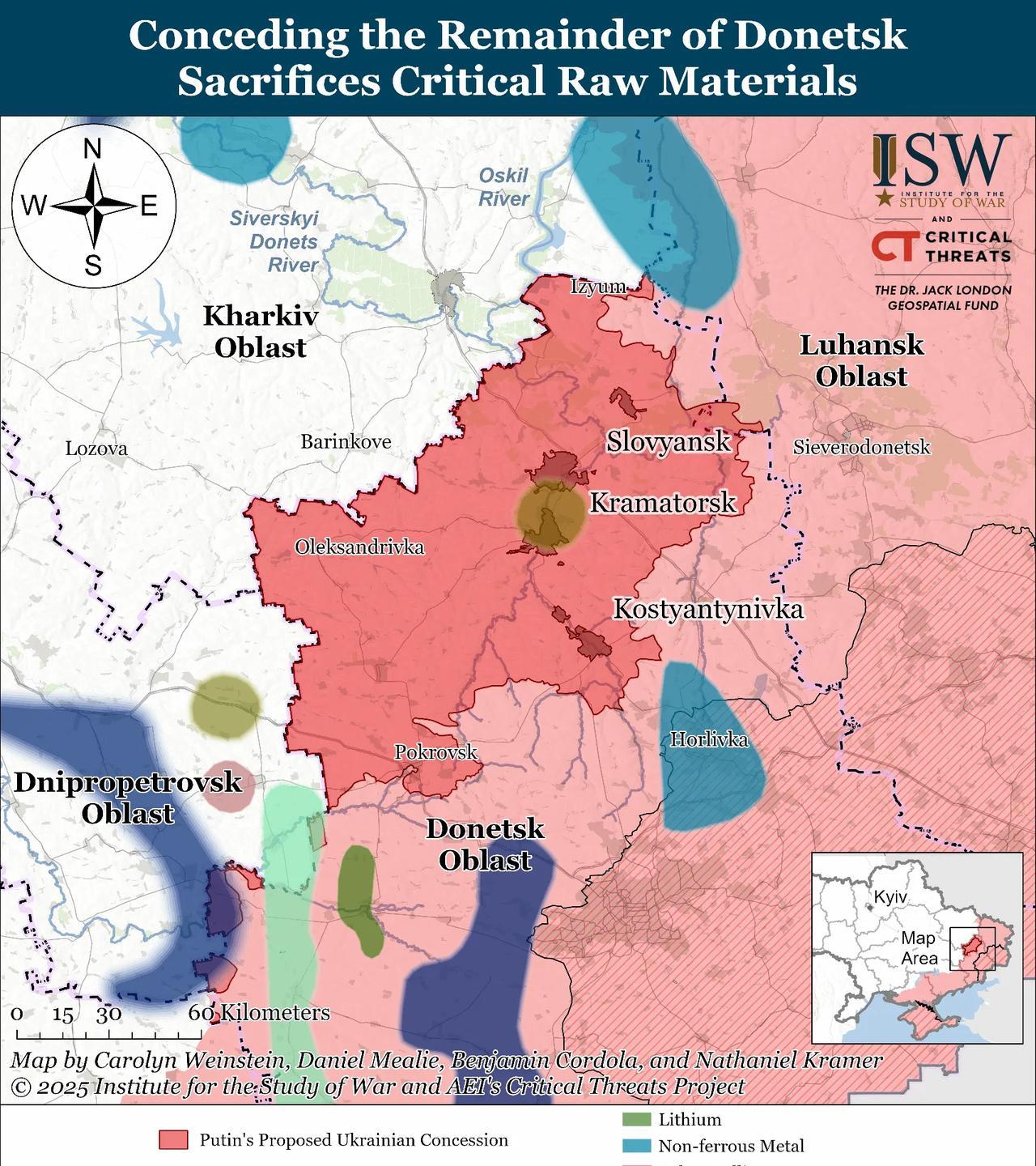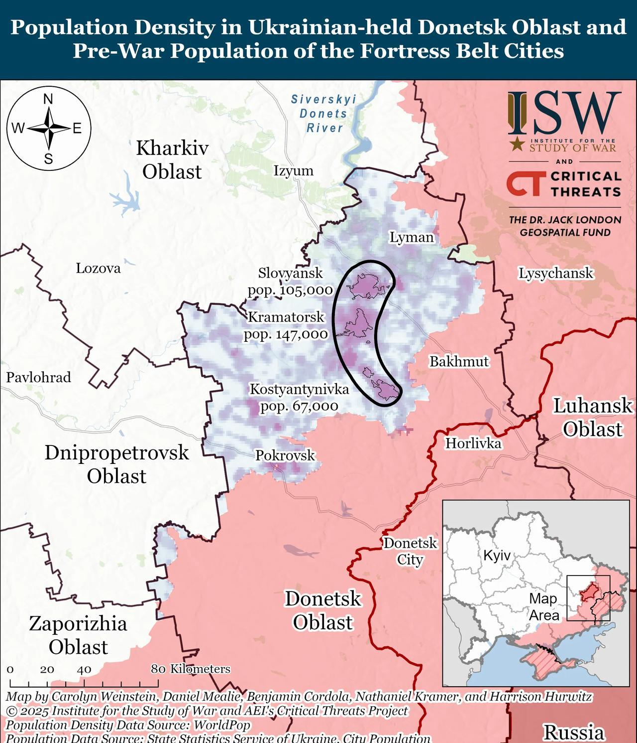 ISW 预测:如果乌克兰失去对顿涅茨克地区的控制,对前线的影响(地图) 俄罗斯官员要求,乌克兰割让顿涅茨克地区具有重要战略意义的未占领领土。而作为这一提议的交换,俄罗斯没有什么可提供的。 美国战争研究所 (ISW) 报告。 据ISW报道,普京的提议要求,乌克兰放弃一个关键的防御阵地,来交换利益,但是,俄罗斯军队,目前没有办法迅速占领这个阵地。 “普京立场的详细条款仍不清楚。然而,包括美国中东问题特使维特科夫在内,特朗普政府的官员,对普京的状况提出了四种不同的陈述,”分析人士写道。 目前,要塞地带,由四座大城市和几个城镇及定居点组成,沿着 H-20 科斯季扬季尼夫卡-斯洛维扬斯克高速公路从北向南延伸。防御地带长度为50公里。 分析人士指出,乌克兰在过去 11 年里,一直在加强这些城市及其周边地区的防御结构。斯洛维扬斯克和克拉马托尔斯克构成了堡垒地带的北半部,是乌克兰军队在顿涅茨克地区防御的重要后勤枢纽。 堡垒地带的南半部是德鲁日基夫卡、阿列克谢沃-德鲁日基夫卡、康斯坦丁诺夫卡。在 2014 年 4 月,乌克兰从占领者手中夺回这些城市后,首次开始在这些城市及其周边地区建立防御阵地。 “俄罗斯未能在 2022 年占领斯洛维扬斯克,以及为夺取堡垒带,而进行的持续斗争,凸显了乌克兰加强堡垒地带城市的成功。目前,俄罗斯军队仍试图从西南包围堡垒带,并试图占领它,这可能需要几年时间,”ISW 指出。 割让领土将如何影响前线: 分析人士认为,如果允许俄军在顿涅茨克地区接触线占据阵地,将迫使乌克兰军队,在哈尔科夫和第聂伯罗彼得罗夫斯克地区边境地区,紧急修建大规模防御工事。然而,这种地形不太适合防御线。 预计,完成后的乌克兰防线,将穿过开阔的田野,而奥斯基尔河和西维尔斯基顿涅茨河等自然障碍物位于太东,无法作为乌克兰军队的防御阵地。 顿涅茨克地区边境的潜在停火,还需要对与大规模长期停火监测任务兼容的基础设施进行大规模投资。 同时,俄罗斯在顿涅茨克-哈尔科夫和顿涅茨克-第聂伯罗彼得罗夫斯克地区边境的阵地,将为未来对哈尔科夫或第聂伯罗彼得罗夫斯克地区邻近地区的进攻,提供比目前的防线更有利的起点。 【有关放弃顿涅茨克阵地的两影响,可以参加,本号今日发布的泽连斯基与记者会面时表达的观点。】 特别是,俄罗斯占领下的顿涅茨克地区利曼,将为俄罗斯人攻击奥斯基尔河东岸哈尔科夫地区的乌克兰阵地创造有利条件。 俄罗斯军队可能会试图扭转在 2022 年的形势,并利用斯洛维扬斯克和 E-40 哈尔科夫-新沙赫金斯克高速公路沿线的进一步推进来攻击伊久姆。 俄罗斯军队还占领了波克罗夫斯克西南第聂伯罗彼得罗夫斯克地区边界沿线的有限阵地。然而,割让顿涅茨克地区的其余地区,将使俄罗斯人避免正在进行的占领波克罗夫斯克的损失。 俄罗斯军队也不必通过乌克兰最西端的防线,多布罗皮利亚-比洛泽尔斯克-新顿涅茨克-奥列克桑德里夫卡进行战斗,这条防线也从北到南延伸,类似于堡垒带。因此,割让顿涅茨克地区的其余地区,也将为俄罗斯军队提供更有利的位置,来进攻第聂伯罗彼得罗夫斯克地区。