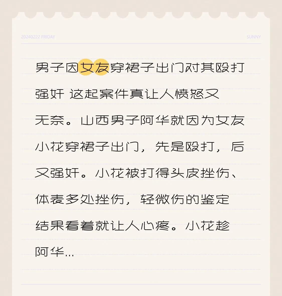 男子因女友穿裙子出门对其殴打强奸 男子因女友穿裙子出门就对其殴打并强奸,这起案件实在是令人既愤怒又无奈啊。山西有个男子叫阿华,就因为他的女友小花穿着裙子出门,先是对小花一顿殴打,而后又实施了强奸。小花被打得头皮挫伤,体表也有多处挫伤,那轻微伤的鉴定结果真的是让人看了十分心疼。