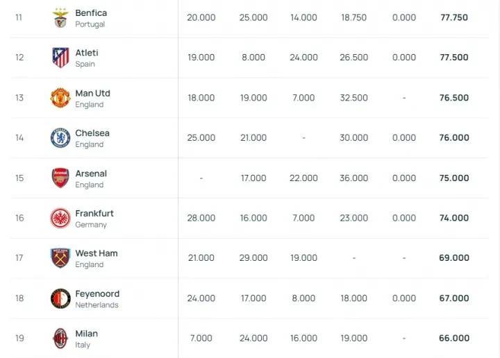 足坛俱乐部最新欧战积分排名!按照近5年欧战成绩来统计的。 没想到这曼联都没欧战踢了,还在排在阿森纳前面,看来曼联近5拿了两个欧联亚军拿的积分还是不少的。 不过曼联下赛季要是再拿不到欧冠资格,可能明年就会从这个榜单中消失。 这榜单让我没想到的是前10里德甲竟然有3家俱乐部。而且更让我没想到的是勒沃库森怎么会排在多特的前面?药厂不就是去年的欧联亚军和今年欧冠的16强吗,人家多特去年欧冠亚军,今年欧冠8强啊。 还有这罗马是怎么混进前十的?话说这意甲全靠国米一个人啊。