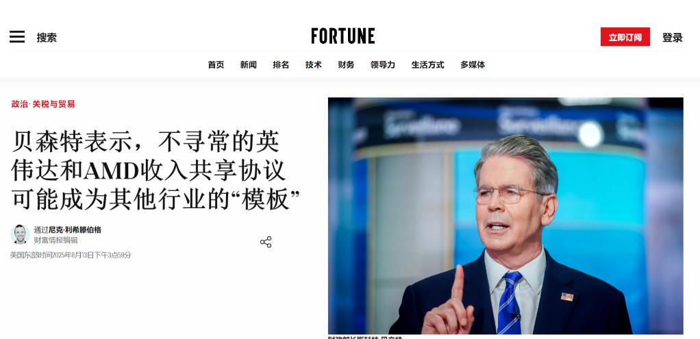彻底疯魔,美国准备对所有对华出口的高科技产业,强制征收销售分成,英伟达、AMD只是第一批。 当地时间8月13日,美国财长贝森特对外表示:“美国芯片企业向中国出口、需要向美国政府上缴销售分成”的机制,不久也将在其它行业看到。 前几天,美国政府刚刚宣布:批准英伟达、AMD等美国企业,恢复向中国市场销售芯片产品;但作为“回报”,英伟达、AMD必须把它们在中国市场销售收入的15%,上缴美国财政部。英伟达、AMD答应了这一条件。 在这个关键时刻,美国财政贝森特说“英伟达、AMD的机制,不就将在其它产业看到”,这就意味着:美国政府正在考虑对其它对华出口的高科技产业,包括但不限于半导体制造设备、生物技术、航空航天设备及其零部件、人工智能大模型、原研药知识授权等,强制征收销售分成。 这对于中国市场销售收入占比较大的美国高科技企业来说,无益于一个重大打击。强制征收销售分成,会严重削弱它们的净利润,并影响它们在中国市场的价格竞争力。高通、美光科技、应用材料公司,都要瑟瑟发抖。 而根据特朗普第一届执政(2017-2020)时期通过的《出口管制改革法》,企业在提交出口许可申请时,美国政府不得向企业收取手续费;如今第二届特朗普政府,把上缴销售分成和允许出口许可相互挂钩,明显是违反了自己制定的法律,自我打脸了。 但说实话,脸面哪有挣钱重要。这一届的特朗普政府,最重要的执政目标,就是搞钱,不顾一切底线和脸面的搞钱。此前几个月,他们用加征关税敲诈全球各国,让世界给美国政府交钱(包括但不限于高价买美国能源、向美国投资千亿美元等);如今他们开始敲诈本国高科技企业,强制让他们上缴销售分成。 对于此等没有底线的流氓做法,近期华尔街有投行分析师批评道:特朗普总统搞得是敲诈资本主义,实行的是流氓市场经济,总统个人和政府,对企业的干预,已经超过了中世纪的国王。 这位投行分析师的说法,可谓一针见血,如今的特朗普政府,为了搞钱,已经把自由美利坚搞成中世纪美利坚了。