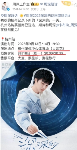 今天周深工作室官宣了杭州场的演唱会开票时间,预售时间:8月18日(周一)20:00/20:30 演出地点:杭州奥体中心体育场(大莲花),大家记得调好闹钟!