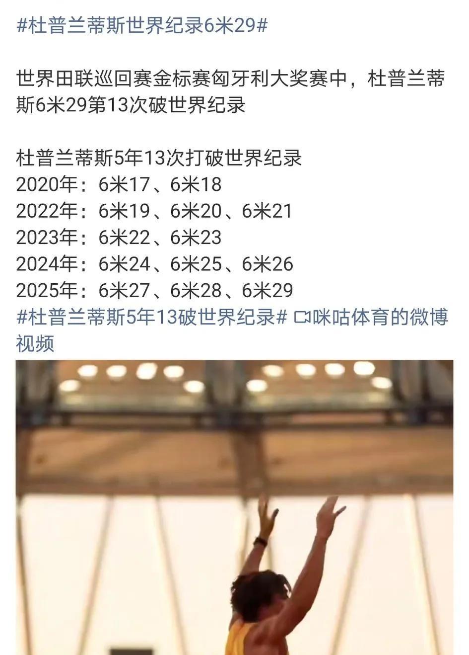 杜普兰蒂斯5年13破世界纪录!这次将撑杆跳纪录扩大到了6.29米! 杜普兰蒂斯以“1厘米哲学”持续改写人类极限,6米29并非终点,他公开表示瞄准6.35米-6.40米,称“天空才是极限”。 国际田联为每次新纪录提供10万美元奖励,赞助商另追加3万-10万美元,累计破纪录奖金超120万美元。