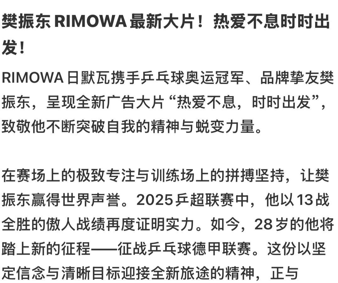 樊振东最新宣传大片——热爱不息 时时出发 8月14日,樊振东最新宣传 海报曝光, 宣传片把樊振东拍的真帅, 怼脸拍最帅! 金色最好,是樊振东的颜色, 莫问前路,尽是坦途, 期待樊振东的新征程! 青春男大的樊振东, 很适合正装, 走商务范儿, 有老板气质! 帅出新高度,合格机场都来一张 得是全球代言人才行! 都市精英男的感觉, 高级的帅! 樊振东加油, 德甲比赛一切顺利, 8月27日,樊振东将在俱乐部 开赛前有新闻发布会, 期待一下吧!
