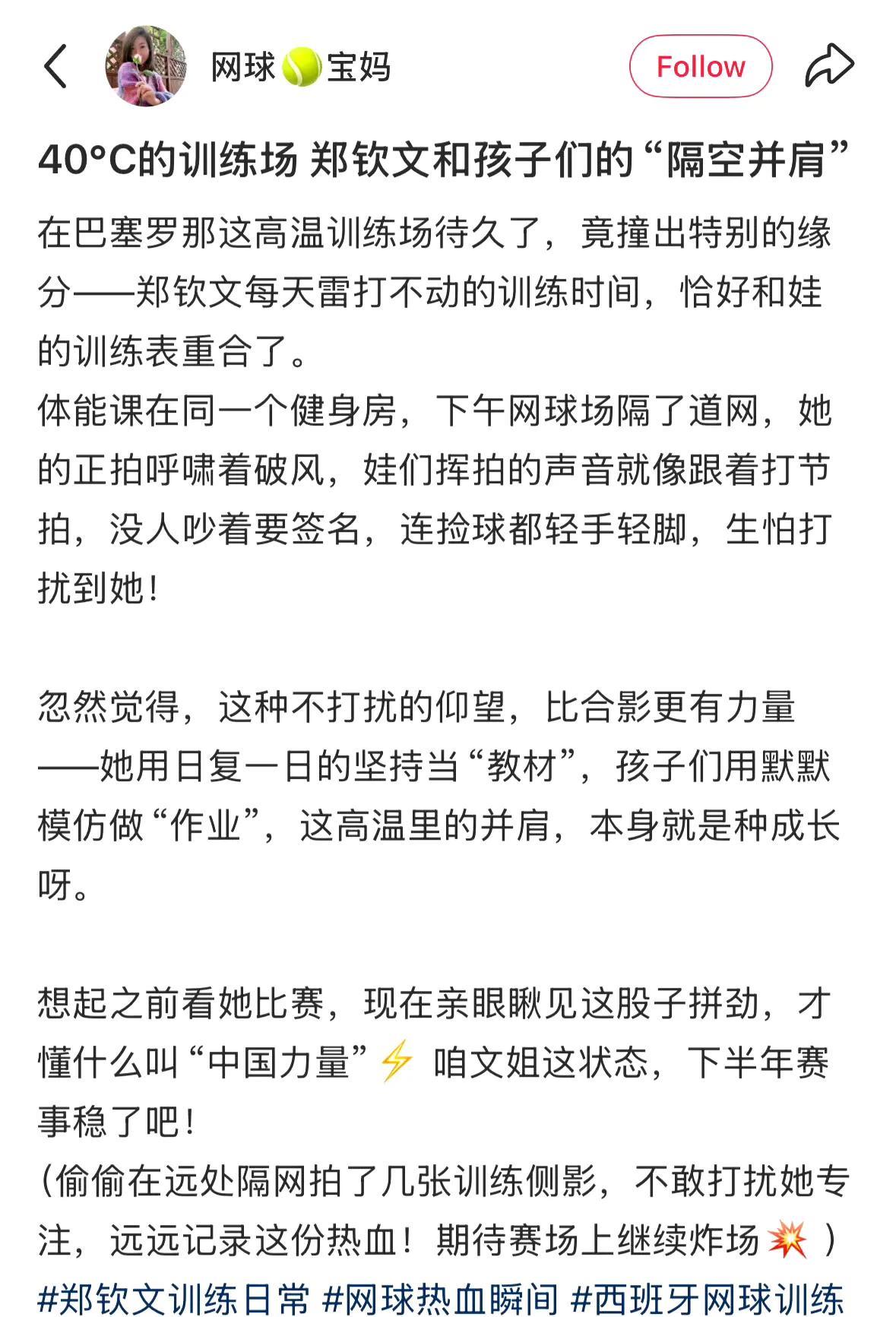 新鲜的郑钦文来了! 有网友在西班牙巴塞罗那碰到文文,她已经开始挥拍训练了,可见文
