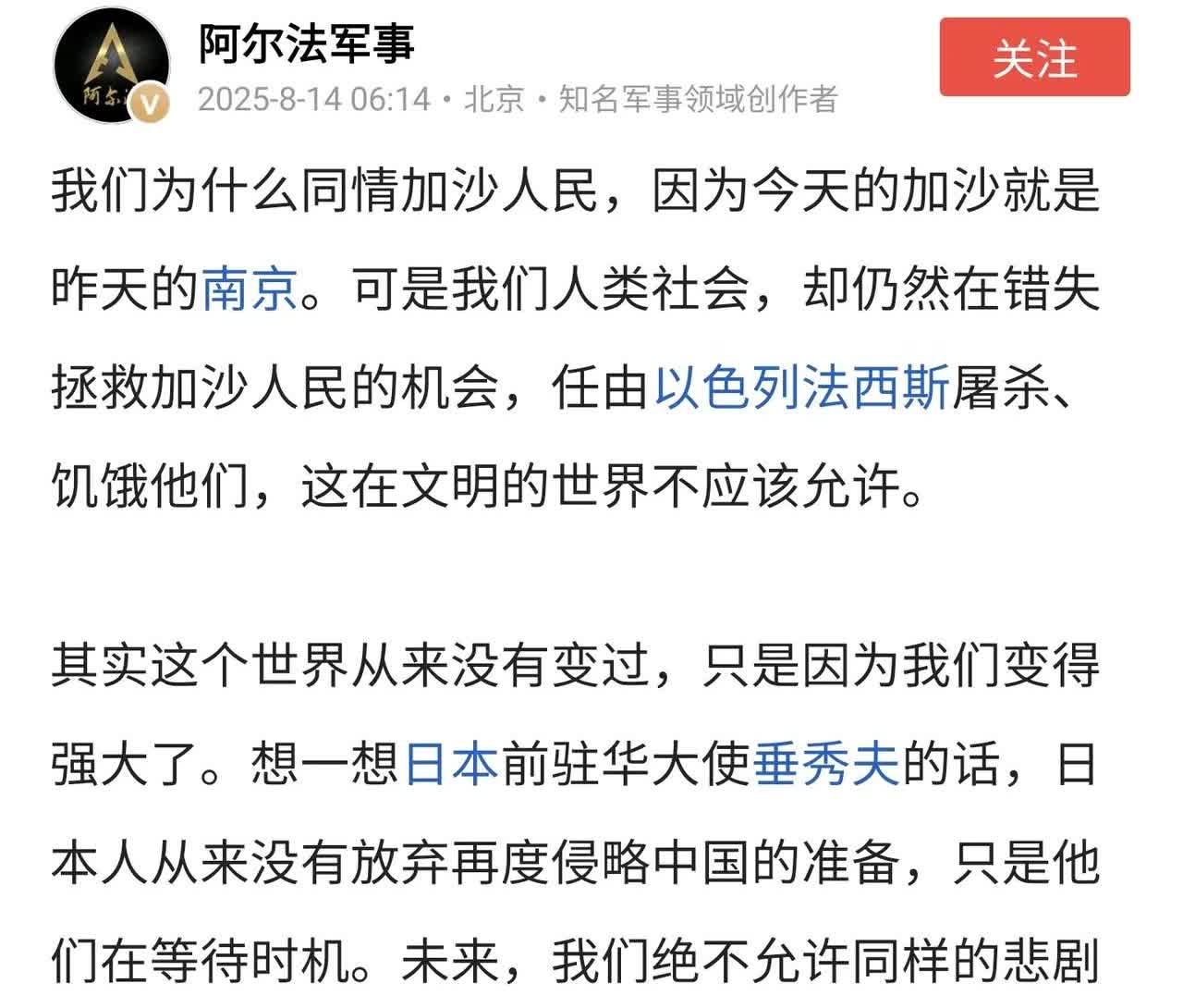 阿尔法军事你这个左棍:南京人民善良不搞恐怖主义! 我们有千千万万革命烈士用生命换来今天的和平和幸福,加沙人做了什么?拉帮结派搞内讧,搞恐怖,世世代代靠吃救济为生,难道全世界都要一直供养他们吗?