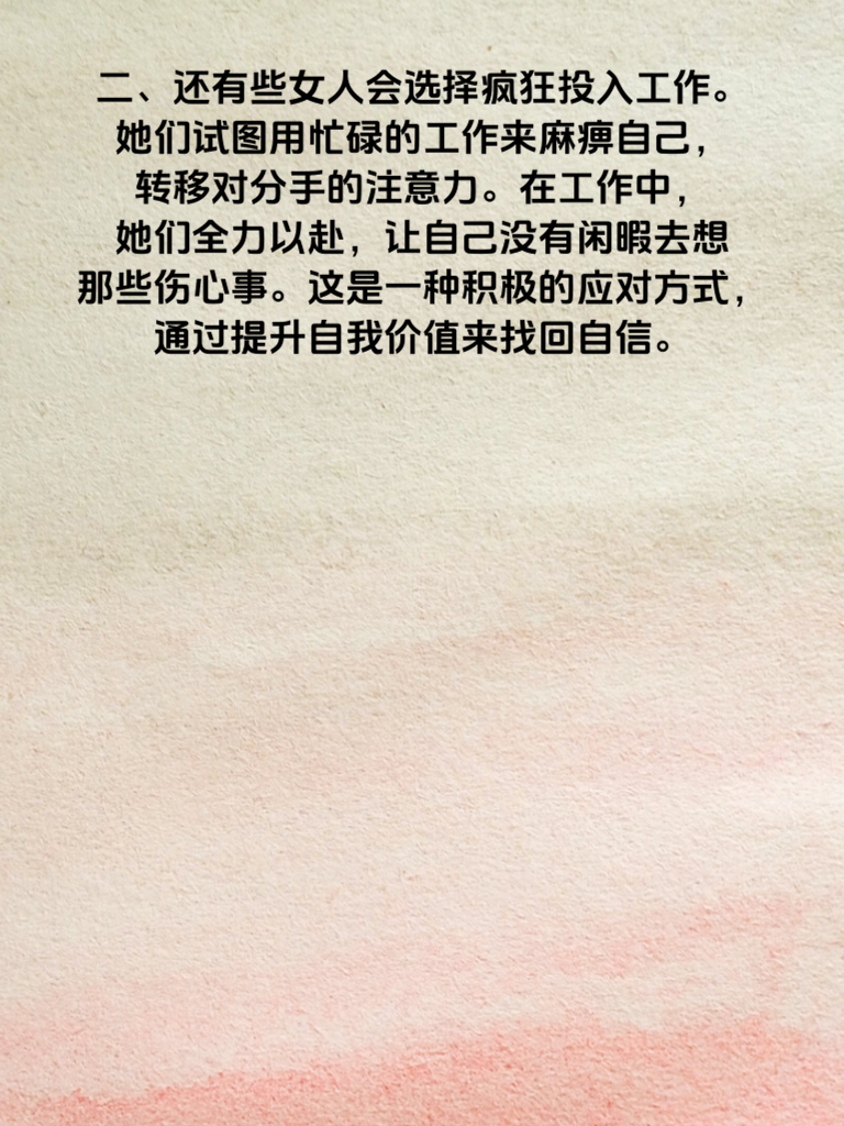 一、分手后,有些女人会陷入深深的自我封闭。她们不再像以前那样积极地参与社交活动,而是把自己关在家里,沉浸在回忆和悲伤之中。这种举动源于她们内心的痛苦和对失去的不舍。她们需要时间来独自疗伤,梳理自己的情绪。 二、还有些女人会选择疯狂投入工作。她们试图用忙碌的工作来麻痹自己,转移对分手的注意力。在工作中,她们全力以赴,让自己没有闲暇去想那些伤心事。这是一种积极的应对方式,通过提升自我价值来找回自信。 三、另外一部分女人会开启全新的社交生活。她们频繁参加各种聚会、活动,结识新的朋友。这不仅是为了填补感情的空缺,更是想重新证明自己的魅力。她们希望在新的社交圈子中,找到新的快乐和可能的爱情。