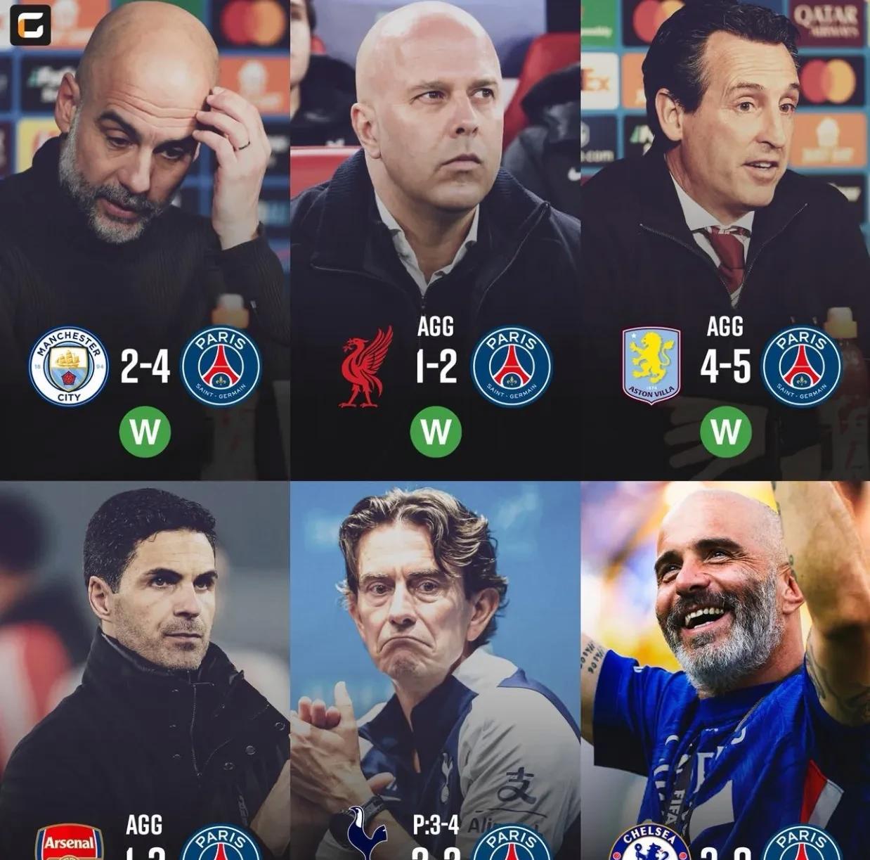 巴黎连斩英超5大豪门,英超前三利物浦、阿森纳、曼城都成为巴黎的手下败将。巴黎如果