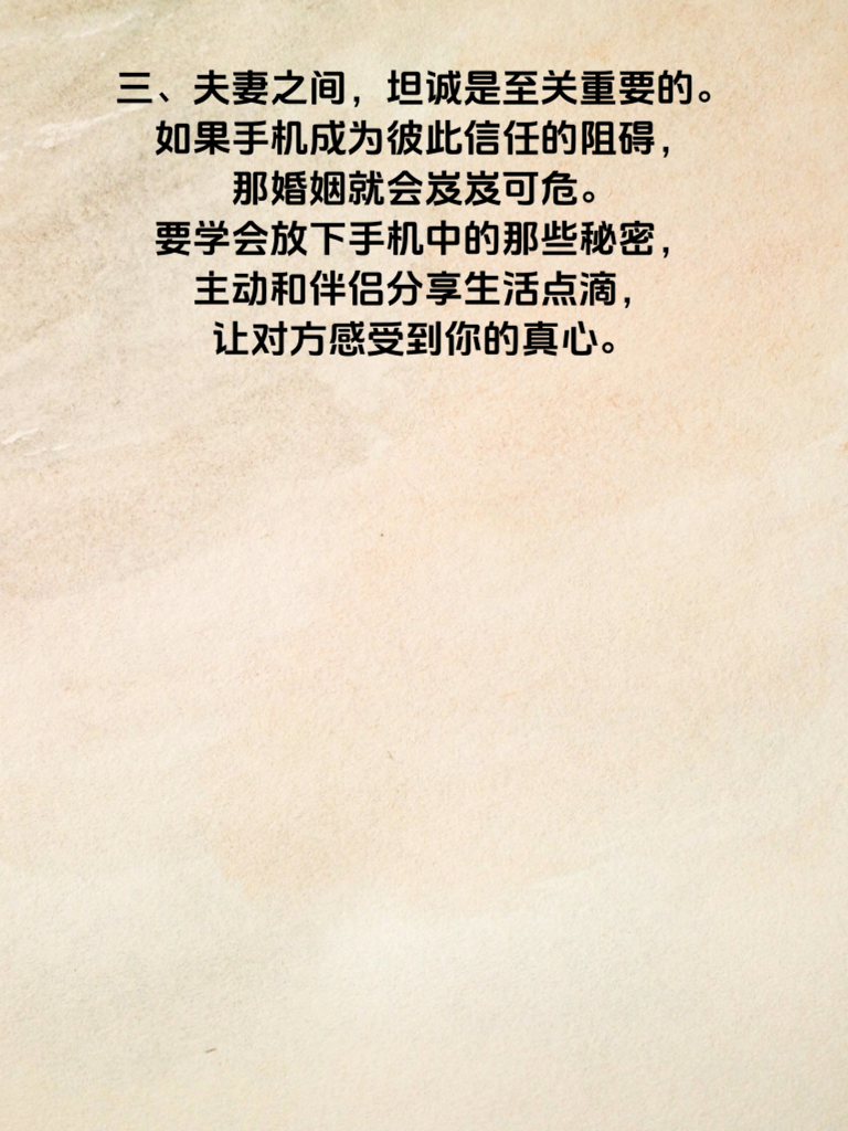 一、在当今这个手机不离手的时代,手机似乎成了每个人最私密的小世界。然而,你知道吗?手机里藏着的秘密,正悄然影响着婚姻,甚至让出轨率飙升。 二、很多时候,手机成了情感的“隐形杀手”。背着伴侣偷偷查看手机,或者手机设置重重密码,这背后往往藏着不可告人的秘密。也许是和某个暧昧对象频繁联系,也许是参与一些不该有的社交活动。 三、夫妻之间,坦诚是至关重要的。如果手机成为彼此信任的阻碍,那婚姻就会岌岌可危。要学会放下手机中的那些秘密,主动和伴侣分享生活点滴,让对方感受到你的真心。 四、当手机不再有秘密,夫妻间的信任得以重建,婚姻才能更加稳固。别让手机成为破坏婚姻的元凶,用心经营,才能让爱情在婚姻中长久保鲜。