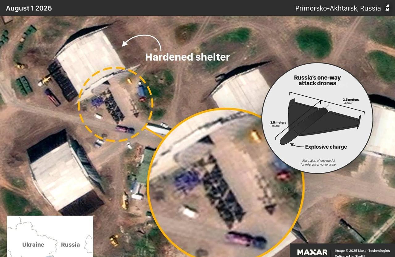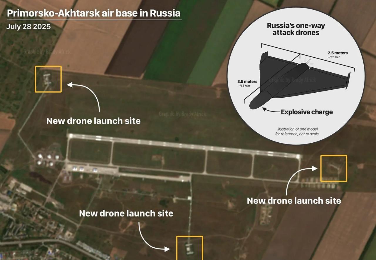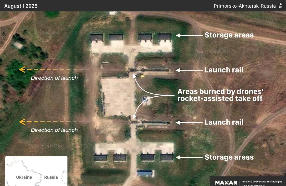 西方分析师士发布的俄罗斯普里莫尔斯科-阿赫塔尔斯克机场的卫星图像,该机场是“天狼星-2”神风无人机的发射地。 图像显示了受保护的无人机储存设施、许多准备发射的无人机,以及带有火箭助推器痕迹的发射台。在其他机场,无人机是通过皮卡车和弹射器发射的。