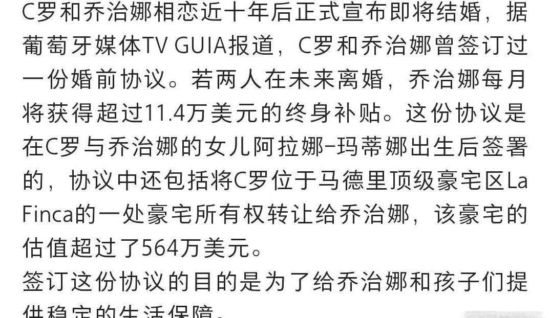 C罗送给女朋友乔治娜的订婚礼物价值397万英镑。 婚前协议早已签好:每月11.4