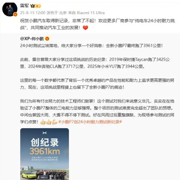 本来以为全新小鹏P7“24小时测试”最终跑了3961公里,就已经够友商喝一壶了。至少雷总就高兴不起来,P7压了YU7一头,YU7跑了3944公里,