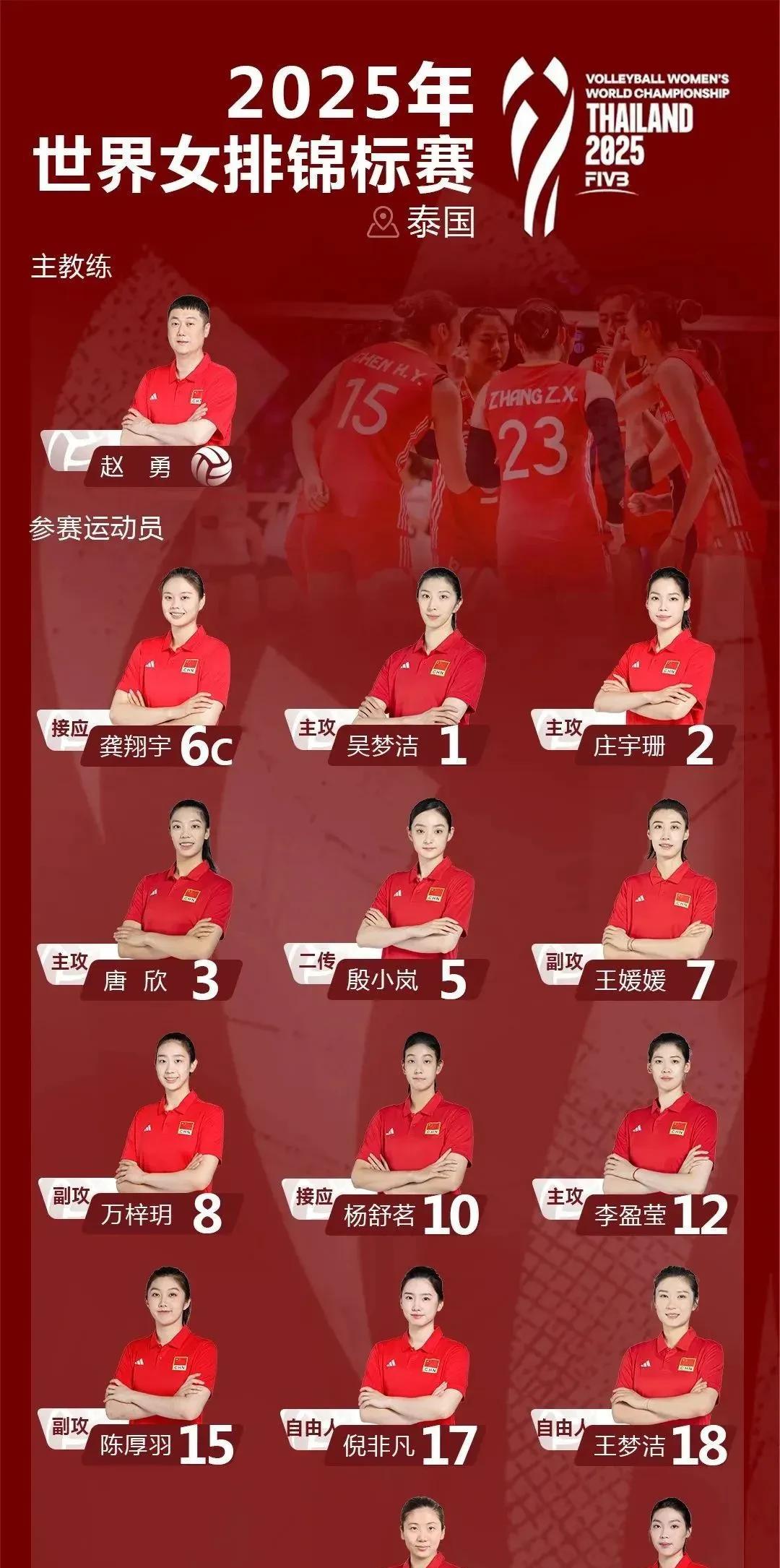 女排世锦赛倒计时一周,中国女排公布了14人的参赛名单: 主攻:吴梦洁、庄宇珊、唐欣、李盈莹副攻:王媛媛、万梓玥、陈厚羽、高意接应:龚翔宇(队长)、杨舒茗 二传:张籽萱、殷小岚 自由人:倪非凡、王梦洁 与之前参加世联赛的阵容相比较,李盈莹终于伤愈归队,副攻高意入围,主攻董禹含、接应范泊宁和正在参加U21世锦赛的副攻王奥芊落选。