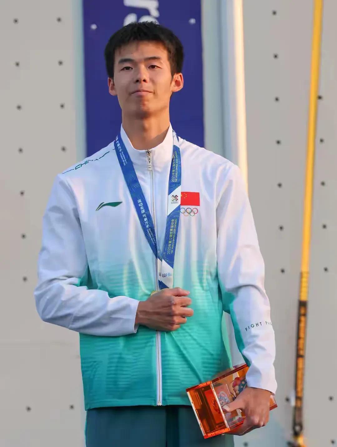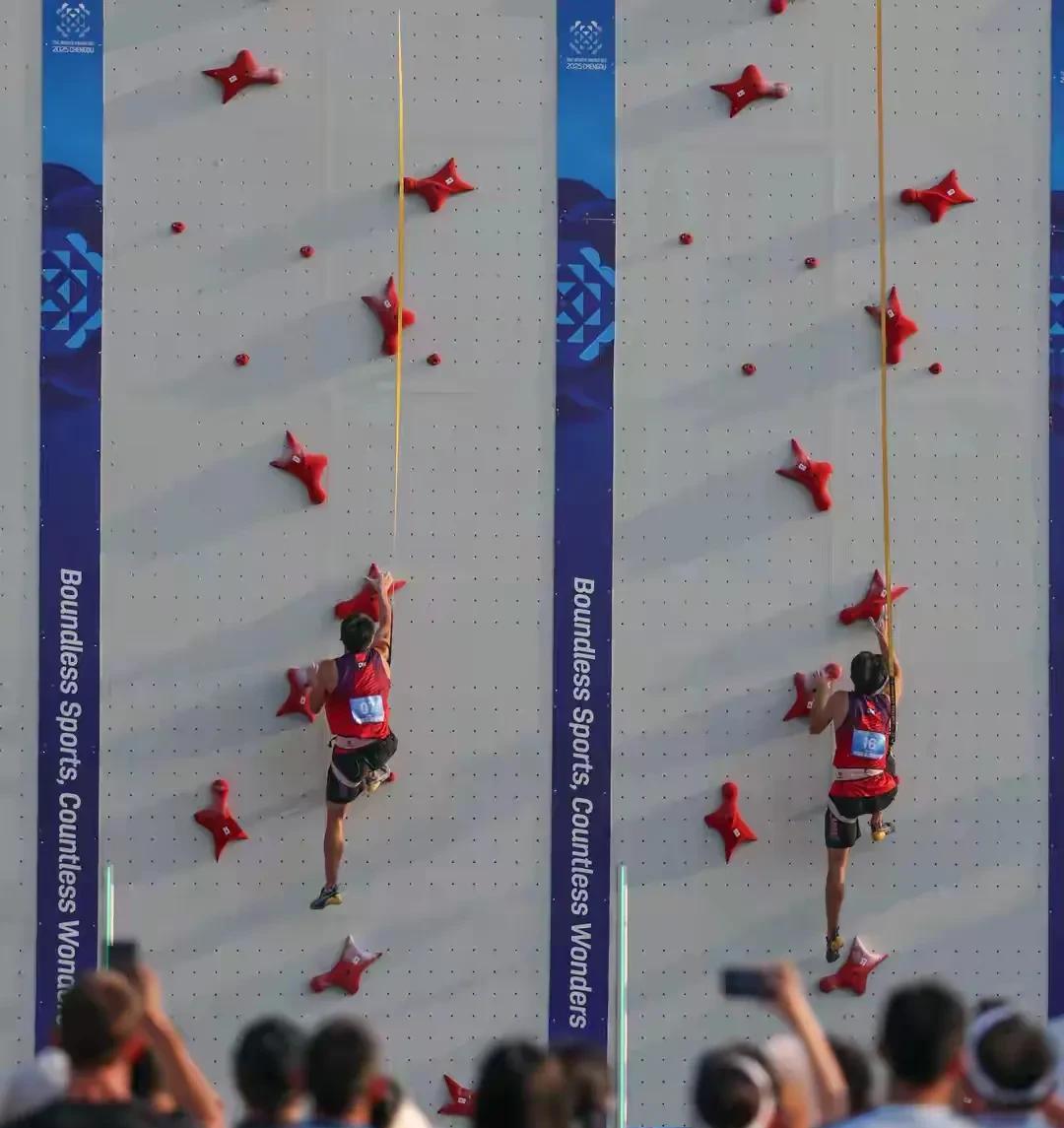 成都世运会速度攀岩个人四条道决赛,23岁的中国选手龙见国以4秒74夺得男子金牌并