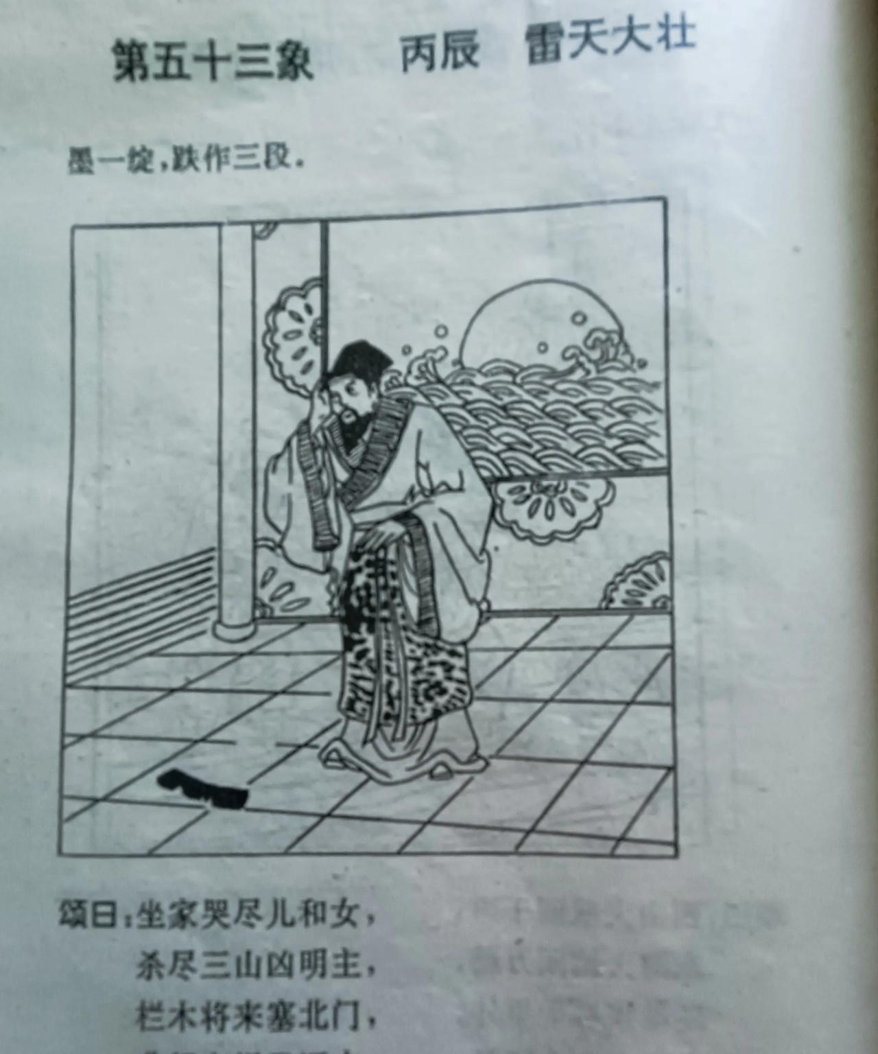 两个不同版本的推背图,第五十三象,虽然同,但图中所表达的意思却大同小异。 颂曰:坐家哭尽儿和女,杀尽三山凶明主,栏木将来塞北门,北门灾祸又还去。 颂曰:一个孝子自西来,手握乾钢天下安,城中两见旌旗美,前人不及后人才。 看这两版不同的五十三象,总是离不开一个,孝,字。望有识之士解读。