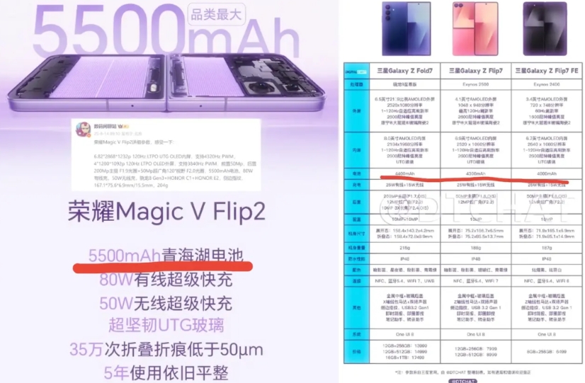 三星彻底傻眼了吧,荣耀小折叠的电池堆的都比三星大折叠电池还要大了,真是没有对比就没有伤害,三星这4000出头的电池完全不够看。 说实话,荣耀这两年的青海湖电池技术大家有目共睹,如今不管是在哪个品类的手机里都是一枝独秀的存在,直板机有荣耀X70的8300mAh,大折叠有荣耀Magic V5的6100mAh,小折叠有荣耀Magic V Flip2的5500mAh,值得一提的是,马上要亮相的荣耀Power2更是会上10000mAh,友商们可得加把劲了