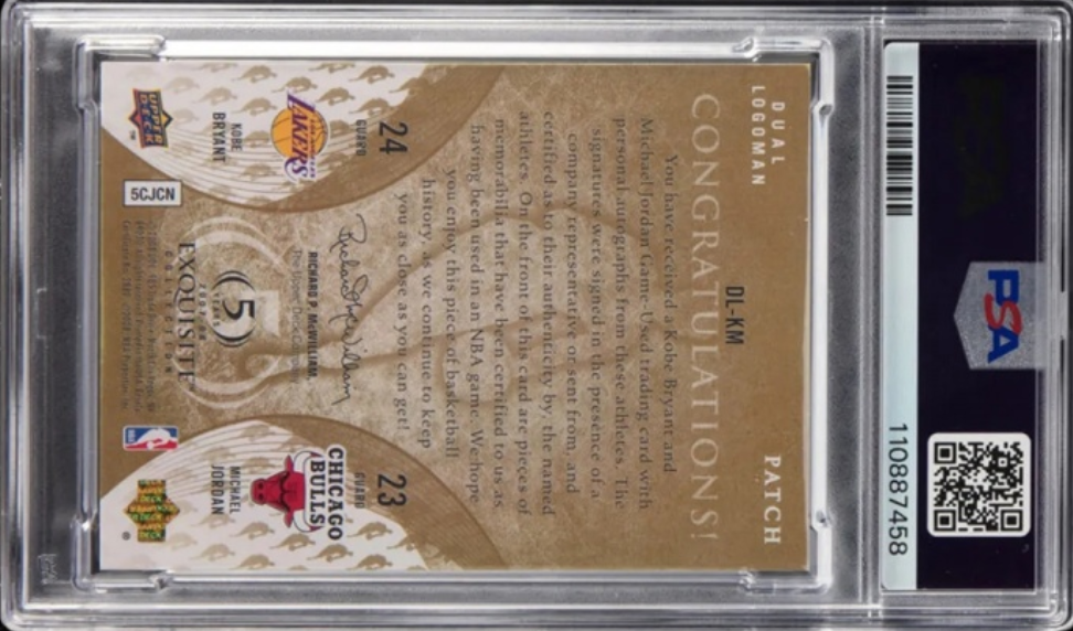 一张承载两代篮球图腾的球星卡,正掀起顶级藏家的疯狂竞逐。全球唯一的乔丹与科比双签名藏品——2007-08 Upper Deck Exquisite系列“双标志签名卡”,在Heritage拍卖行亮相数日便引发血战,天价落槌已无悬念。
