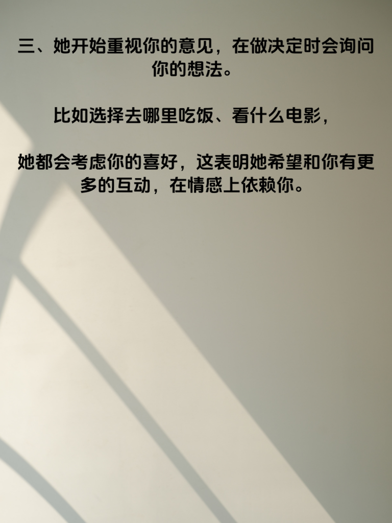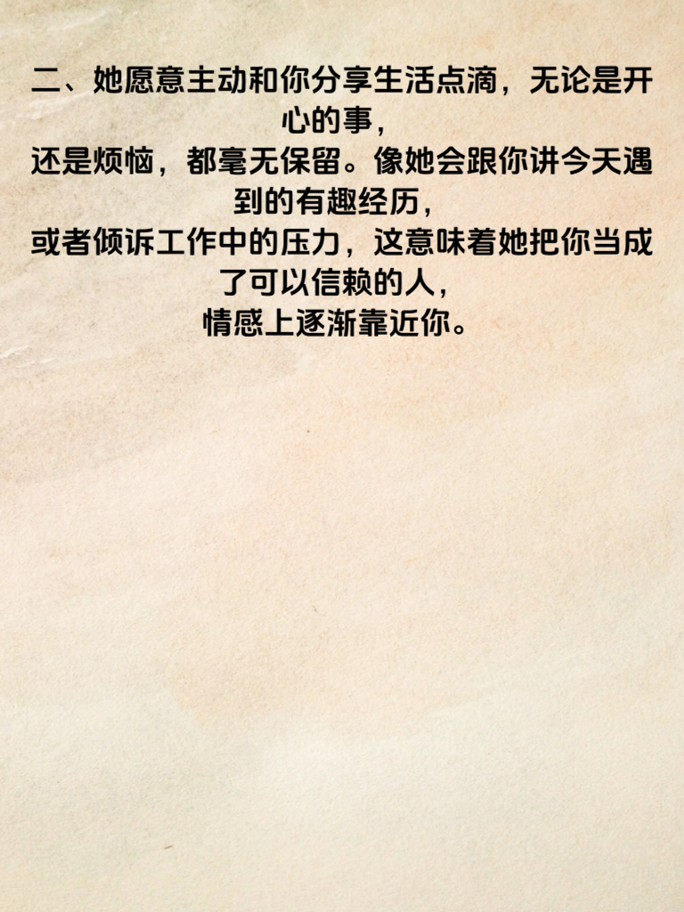 一、在爱情的旅程中,当她向你投来特别的目光,那温柔的眼神里藏着对你的关注,这或许就是她迷途知返的信号之一。比如她总是不自觉地看向你,认真倾听你说话,眼神中满是专注,这说明她开始在意你的一切。 二、她愿意主动和你分享生活点滴,无论是开心的事还是烦恼,都毫无保留。像她会跟你讲今天遇到的有趣经历,或者倾诉工作中的压力,这意味着她把你当成了可以信赖的人,情感上逐渐靠近你。 三、她开始重视你的意见,在做决定时会询问你的想法。比如选择去哪里吃饭、看什么电影,她都会考虑你的喜好,这表明她希望和你有更多的互动,在情感上依赖你。 四、她会精心打扮自己,在你面前展现出最好的一面,注重自己的言行举止,力求给你留下好印象。这是她渴望在你心中有独特位置的体现。 五、当她愿意为你做出改变,比如以前不爱运动,现在却因为你开始尝试,这无疑是她情感转变的有力信号,说明她已经在情感上为你迷途知返,全心投入这段感情。