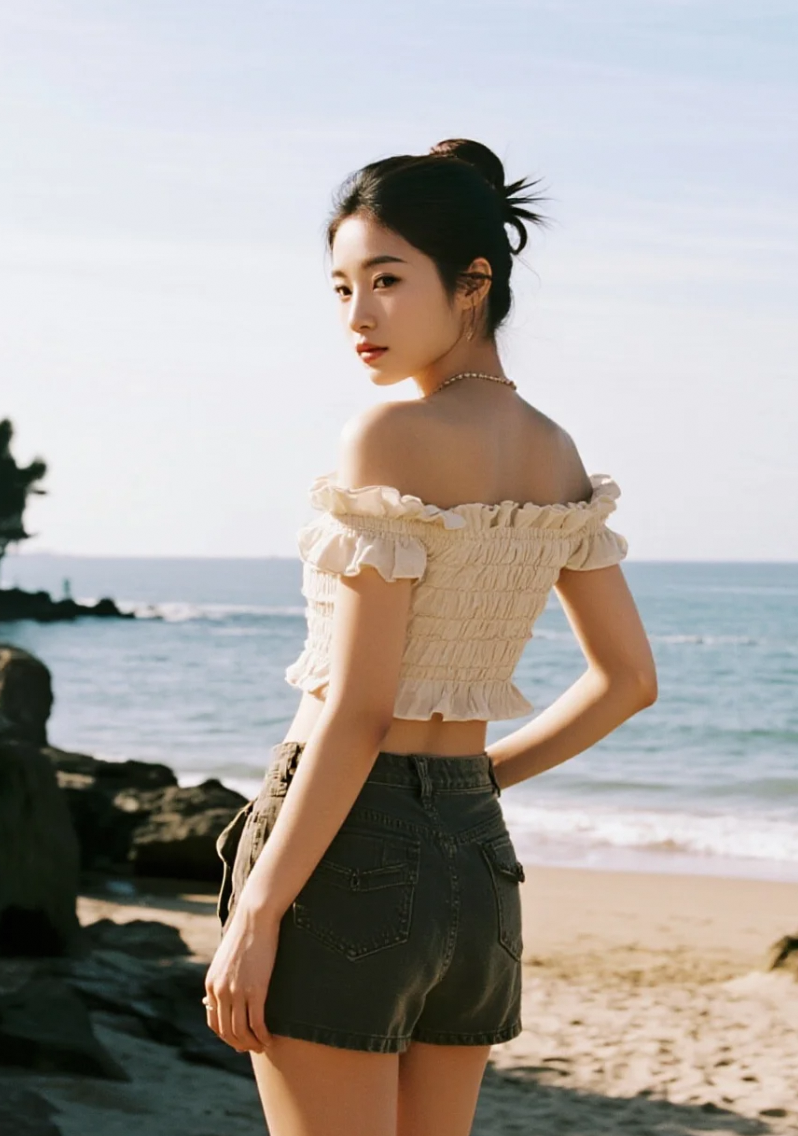 海风吹起她的裙角,美得像幅画