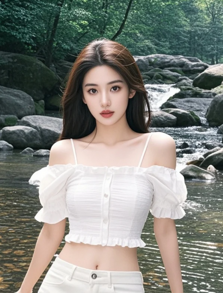 溪水潺潺,她赤脚踩过清波,像一首流动的青春诗。