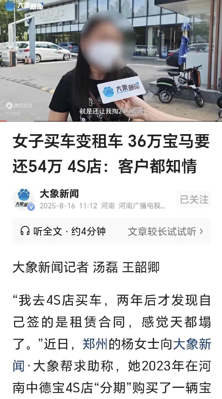 一当又一当,当当不一样!河南郑州,一女子付了6万元首付,买了一辆宝马525Li,落地价36万,给她办了低首付分期,女子在合同上签下名字,还了2年,女子遇到困难,连续2期没有还钱,金融公司将车拖走,要她一次还清剩下的24万,才能把车还她,女子这才发现,自己签的是租赁合同,租金高达54.9万,女子找4s店理论,经理回复:你签了名字,百分百知道是租赁,成年人为自己负责!女子崩溃:天都塌了! 杨女士一直想购买一辆属于自己的车,但是作为一个爱美、爱面子的女子,她的目光望向了宝马汽车,自己的存款并不多,然而张女士买车的愿望特别强烈,于是便拿着自己的存款,想要首付一点钱,剩下的分期进行还款! 并且她其实早早的就看上了宝马525轿车,一直在和4S店的销售人员进行“周旋”,想要将价格给压下去,经过了长达半个月的时间,杨女士和对方达成了一致,以36万元的落地价谈拢,并且杨女士首付给了6万元! 紧接着销售人员给杨女士办理了低首付分期,杨女士对合同方面并不太懂,于是便在纸质合同上签署了自己的名字,将心爱许久的车辆,终于心满意足的开回了家! 但是随着时间的流逝,杨女士已经还款了两年的时间,最近的时候,她的经济上遇到了一点困难,没有钱财用于偿还车贷,于是杨女士便连着两期没有还款,紧接着金融公司便将杨女士的汽车给拖走了,并且联系她,表示要将剩下的24万元一次性还清,才能够将汽车归还给杨女士! 听到对方的要求后,杨女士十分的震惊,因为自己已经还了两年的时间,怎么还有24万元没有还,并且还要一次性还清这笔贷款,甚至杨女士这时候才得知,自己当初和4S店签署的并不是购车合同,而是一份租赁合同,整个合同的租金高达54.9万元! 得知消息后的杨女士气愤不已,直接来到了4S店找工作人员进行理论,然而对方却表示,都是成年人了,当初签署合同的时候,认为杨女士肯定知情的,并且声称杨女士已经偿还两年的时间了,现在肯定是在耍赖不想还款了,才想的这一出! 对此杨女士十分的无奈,与对方发生了争吵,仍然无法得到相应的解决办法,随即便联系了当地的媒体记者,然而记者在中进行调解也无济于事!杨女士绝定走法律程序,来维护自己的利益! 这件事很快被曝光在了网上,事件一经曝光,在网上迅速地,引起了众多网友的热议: 有的网友称道:“所以买房子。车子等大件商品最好请位这方面擅长的律师,合同条款先让律师一句一句的看,别怕请律师的费用,这样可以少很多不必要的麻烦!” 还有的网友说道:“4S店有没有资格对外租赁车子?这应该是重要证据!且4s店有没有在展厅显眼位置张贴租赁业务广告? 因为在百姓眼中,4S店只卖车不租车,才让百姓上当受骗!” 那么,对于这件事的,大家有什么看法? 信源:大象新闻
