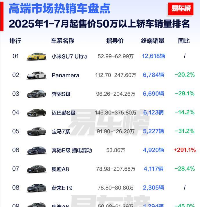 50万元以上纯电和轿车,小米SU7 Ultra可以说是没有对手! 今天,易车网公布了今年前7个月售价50万以上卖的最好的纯电车和售价50万以上卖的最好的轿车,第一名都是小米SU7 Ultra,销量达到了12618辆。 兄弟们,这可是53万元起售的车,卖那么好,雷军怎么做到的?
