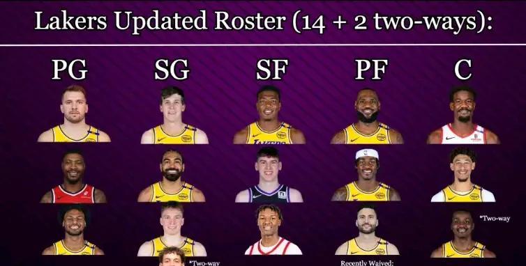 新赛季是湖人队史上的第78个赛季,在过去的77个赛季里:65次季后赛、32次总决赛、17个总冠军。 湖人新赛季预计首发阵容:东契奇、里夫斯、八村塁、詹姆斯和艾顿。 第二阵容:范德比尔特、拉拉维亚、斯玛特、海斯和文森特。 第三阵容:克内克特、迪耶罗、克勒贝尔、布朗尼、2个双向球员。