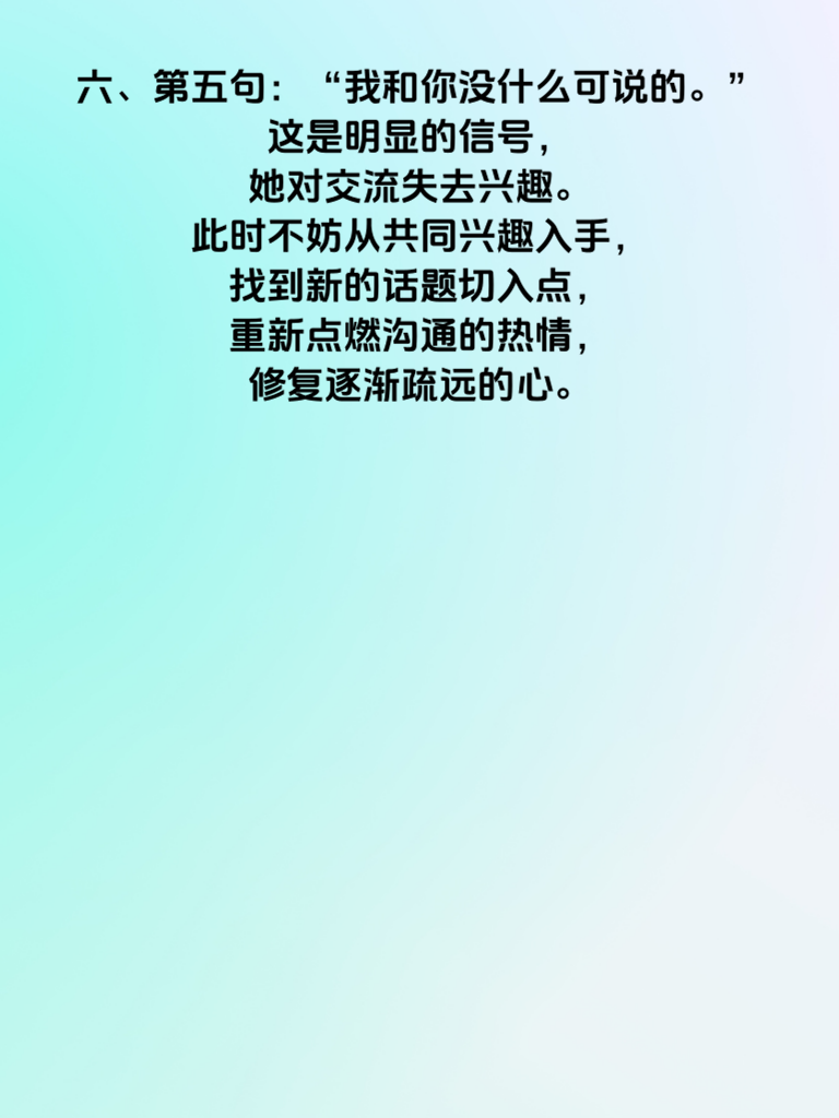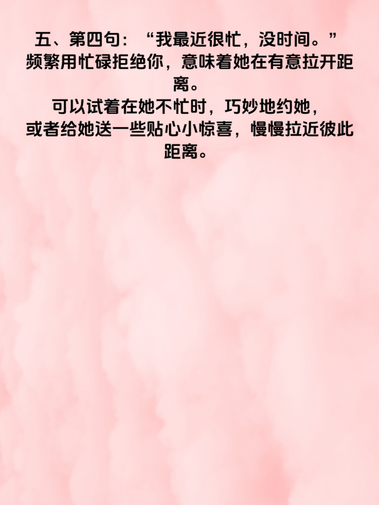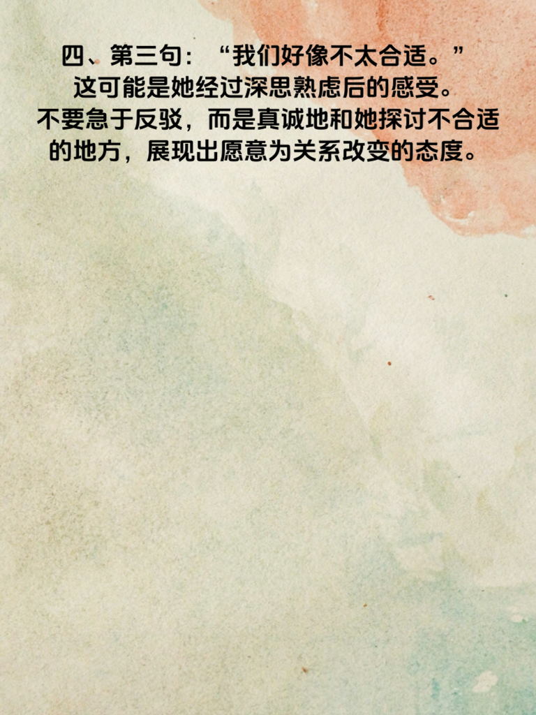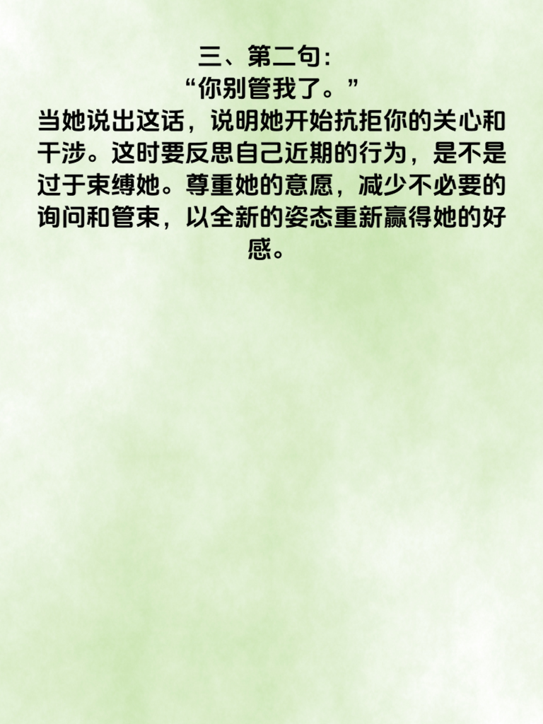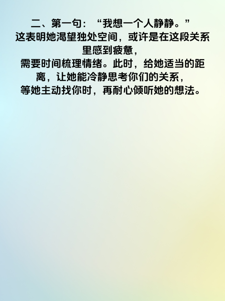 一、在情感的世界里,读懂女人心至关重要。当女人心离你渐远时,往往会通过一些话语透露蛛丝马迹。2025年的情感趋势显示,有这5句话值得格外留意。 二、第一句:“我想一个人静静。” 这表明她渴望独处空间,或许是在这段关系里感到疲惫,需要时间梳理情绪。此时,给她适当的距离,让她能冷静思考你们的关系,等她主动找你时,再耐心倾听她的想法。 三、第二句:“你别管我了。” 当她说出这话,说明她开始抗拒你的关心和干涉。这时要反思自己近期的行为,是不是过于束缚她。尊重她的意愿,减少不必要的询问和管束,以全新的姿态重新赢得她的好感。 四、第三句:“我们好像不太合适。” 这可能是她经过深思熟虑后的感受。不要急于反驳,而是真诚地和她探讨不合适的地方,展现出愿意为关系改变的态度。 五、第四句:“我最近很忙,没时间。” 频繁用忙碌拒绝你,意味着她在有意拉开距离。可以试着在她不忙时,巧妙地约她,或者给她送一些贴心小惊喜,慢慢拉近彼此距离。 六、第五句:“我和你没什么可说的。” 这是明显的信号,她对交流失去兴趣。此时不妨从共同兴趣入手,找到新的话题切入点,重新点燃沟通的热情,修复逐渐疏远的心。