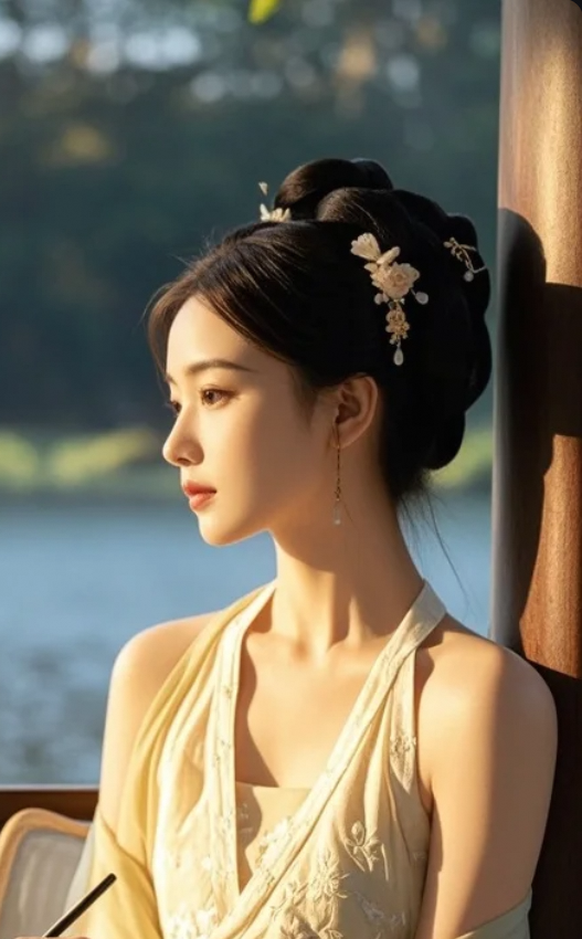 美女凝视远方,侧脸美得像被薄雾轻拥的远山!