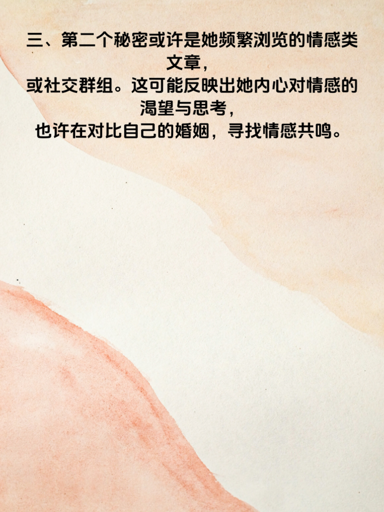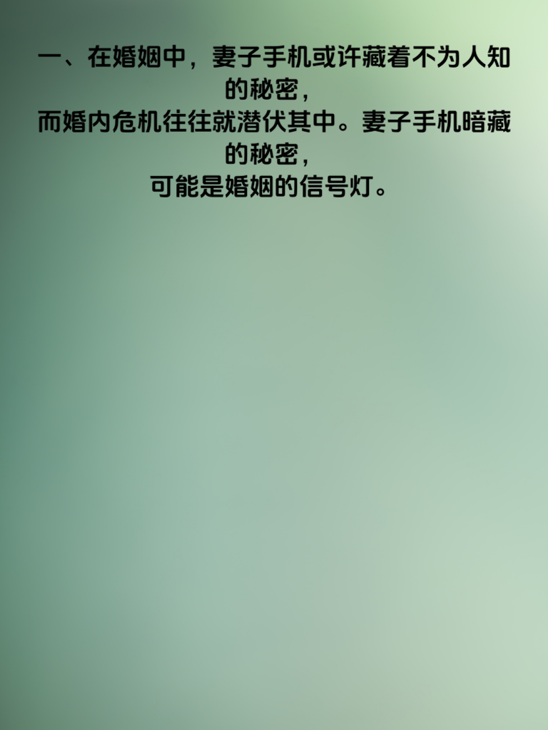 一、在婚姻中,妻子手机或许藏着不为人知的秘密,而婚内危机往往就潜伏其中。妻子手机暗藏的秘密,可能是婚姻的信号灯。 二、第一个秘密可能是她与旧情人的联系。偶尔的问候也许只是礼貌,但频繁互动就得留意了。这可能暗示她对过去情感的留恋,或是对现状婚姻某些方面的不满。 三、第二个秘密或许是她频繁浏览的情感类文章或社交群组。这可能反映出她内心对情感的渴望与思考,也许在对比自己的婚姻,寻找情感共鸣。 四、第三个秘密可能是她手机里一些加密的消费记录。大额不明消费可能是她悄悄满足自己的需求,这背后可能是对婚姻经济分配的不满。 五、第四个秘密也许是她和闺蜜间的密语。闺蜜有时会成为情感倾诉的对象,若她们讨论对丈夫的抱怨,那婚姻关系就需重视了。作为丈夫,要多留意妻子手机这些暗藏的秘密,及时沟通,化解婚内危机,让婚姻重回幸福轨道。
