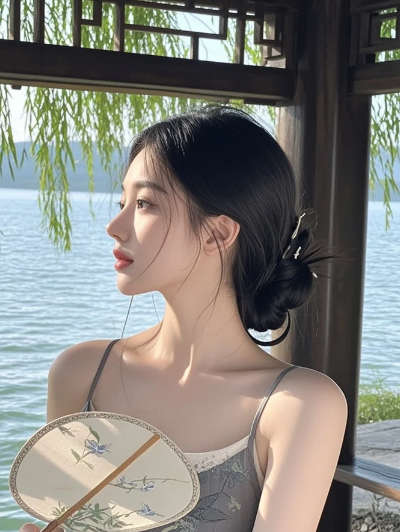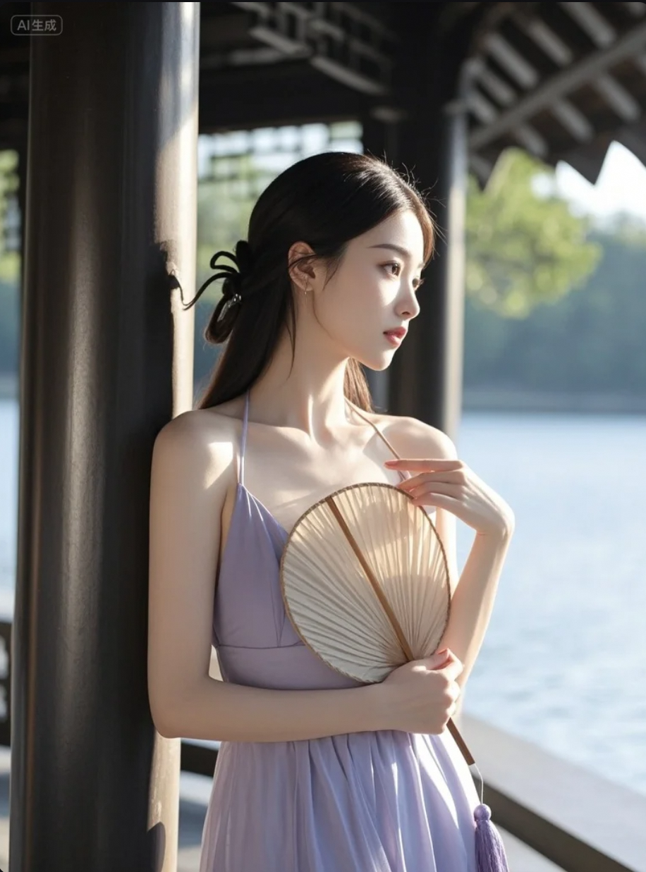 她执扇立于湖畔,风起时,连倒影都在为你回眸