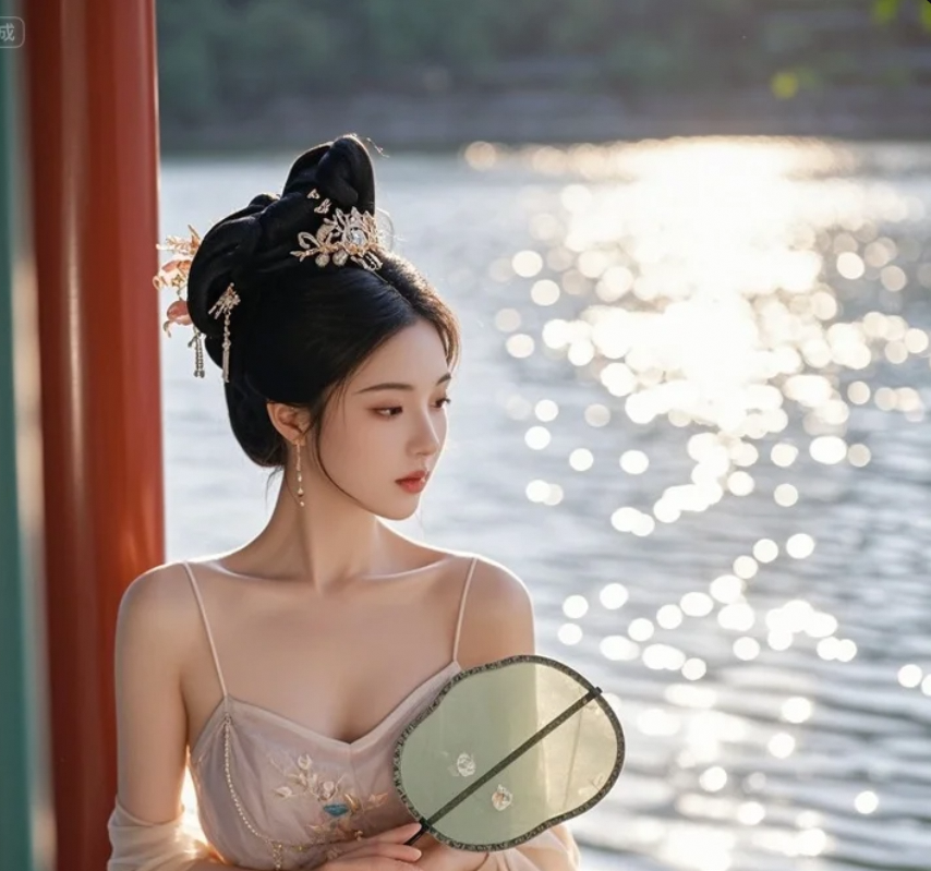 她执扇立于湖畔,风起时,连倒影都在为你回眸