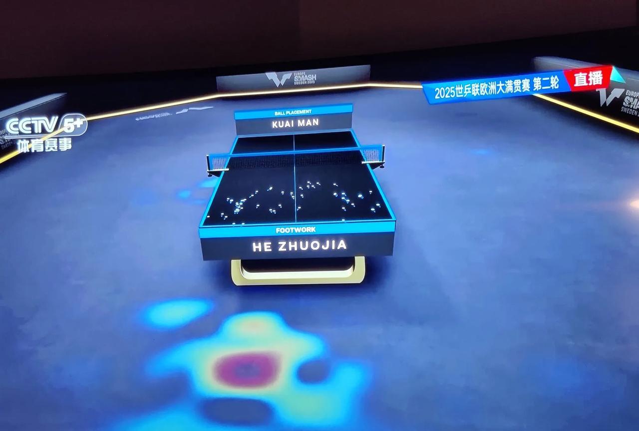 我发现,这次瑞典大满贯有个很特别的地方,这种情况在以前的WTT赛事以及很多的国际比赛中都没有看见。 这是昨天蒯曼和何卓佳的比赛,在比赛结束后,电视上出现这样的画面。 我抓拍了几张。图一是蒯曼发球打球时候球的落点显示。 图二看的更清楚了,除了球的落点,还有何卓佳脚下移动的记录。颜色深浅不一,可能是颜色深的地方,就是她站位最多的地方吧。我就是猜测,我也不懂。 图三从另一个角度来看他们俩移动的数据图像。 我看完以后,真的很感慨。科技无处不在,乒乓球比赛各种设施越来越先进了,包括昨天何卓佳使用的鹰眼挑战。这些在过去想都不敢想,现在都实现了。 运动员场上的一举一动,都在监控范围之内。运动员的各种打法都不是什么秘密了。如何破解,就凭本事了。 也不知道我的猜测对不对,那个影像是不是运动员移步轨迹的记录? #万能生活指南#