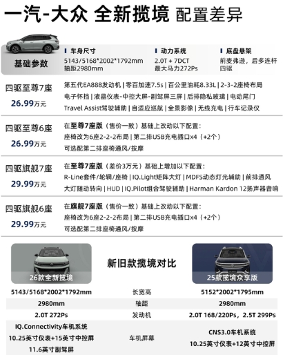 8月5日,一汽-大众全新揽境正式上市。全新揽境采用了大众最新的外观和内饰设计,搭载第五代EA888发动机,并且在智能座舱和辅助驾驶方面也有着不小的提升。 外观:普通版和R-Line版两款外观设计,标配贯穿式LED前灯带、贯穿式LED尾灯和前后发光VW徽标。 动力:第五代EA888发动机+7速湿式双离合,最大马力272Ps,零百加速7.5秒,四驱。 座舱:全新设计内饰,电子怀挡、10.25英寸仪表+15英寸中控屏+11.6英寸副驾屏三屏,造型风格更接近大众ID系列电车;车机搭载IQ.Connectivity系统,功能更多、更流畅。 辅助驾驶:Travel Assist驾驶辅助(至尊)或IQ.Pilot组合驾驶辅助(旗舰),支持自适应巡航、泊车辅助、遥控泊车等功能。